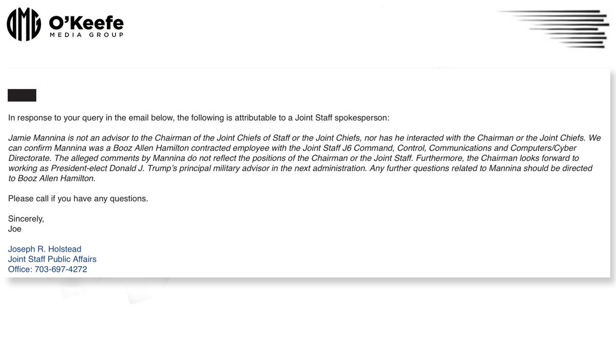 See below the email response @OKeefeMedia received from Joint Staff Public Affairs Spokesman Joseph Holstead regarding Jamie Mannina's termination: https://t.co/vCzgCwRWl7