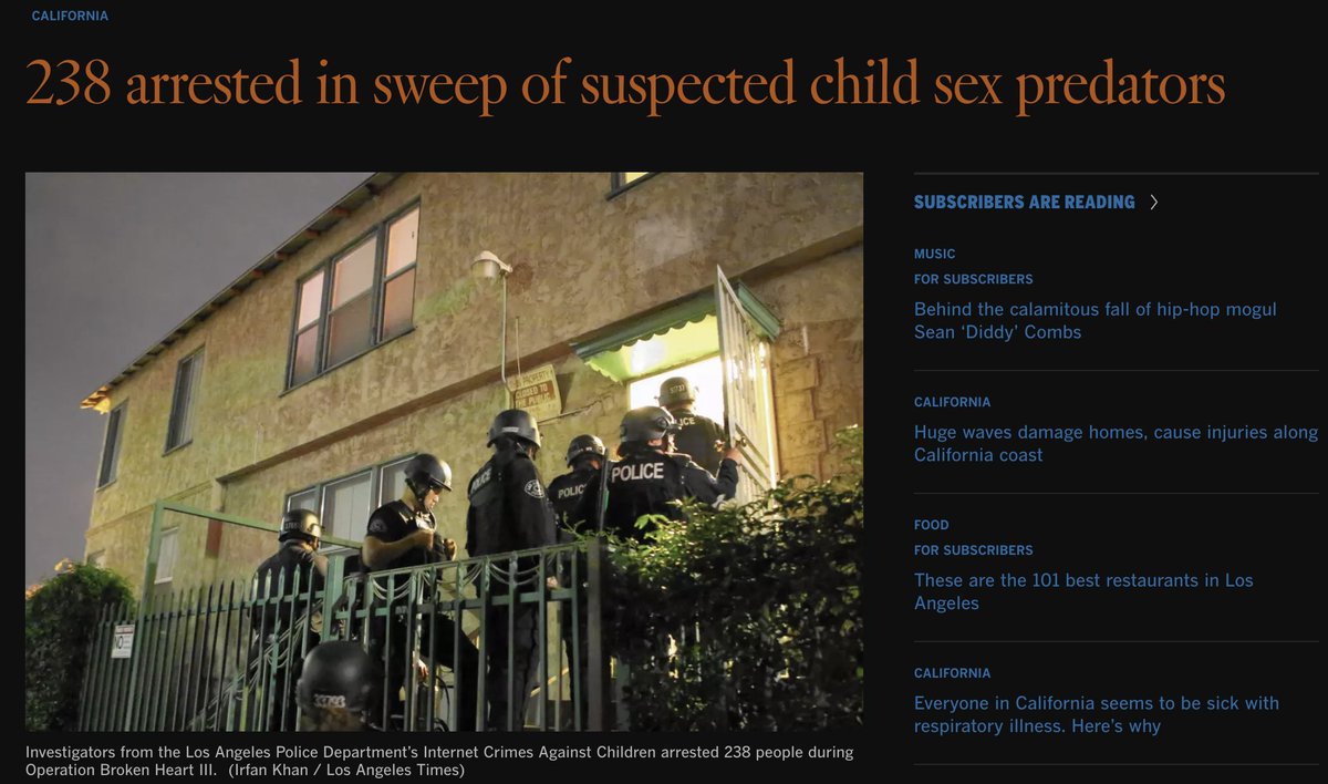 https://www.latimes.com/local/lanow/la-me-ln-operation-broken-heart-arrests-20160621-snap-story.html “A monk from Riverside and an Australian man looking to buy a 6-year-old boy were among 238 people arrested during a two-month operation targeting child predators in Southern California, officials said Monday.” “Among those arrested during sweeps in April and May were entertainers, community leaders, white-collar professionals and clergy members, said John Reynolds, acting special agent in charge for U.S. Department of Homeland Security Investigations.”