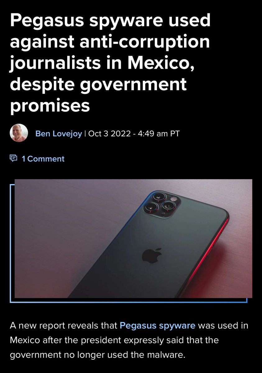 Pegasus is a spyware developed by the Israelicyber-arms company NSO Group that is designed to be covertly and remotely installed on mobile phones running iOS and Android. Pegasus spyware has been used in Mexico since at least 2017 specifically targeting anti-corruption journalists and then rival cartels. Many sectors of Mexican civil society were targeted, including investigative journalists and lawyers for cartel victims’ families, anti-corruption groups, prominent, lawmakers, international investigators examining enforced disappearances, and even the spouse of a journalist killed in a cartel slaying. Despite promises made to stop using it, Pegasus is still being used in Mexico.