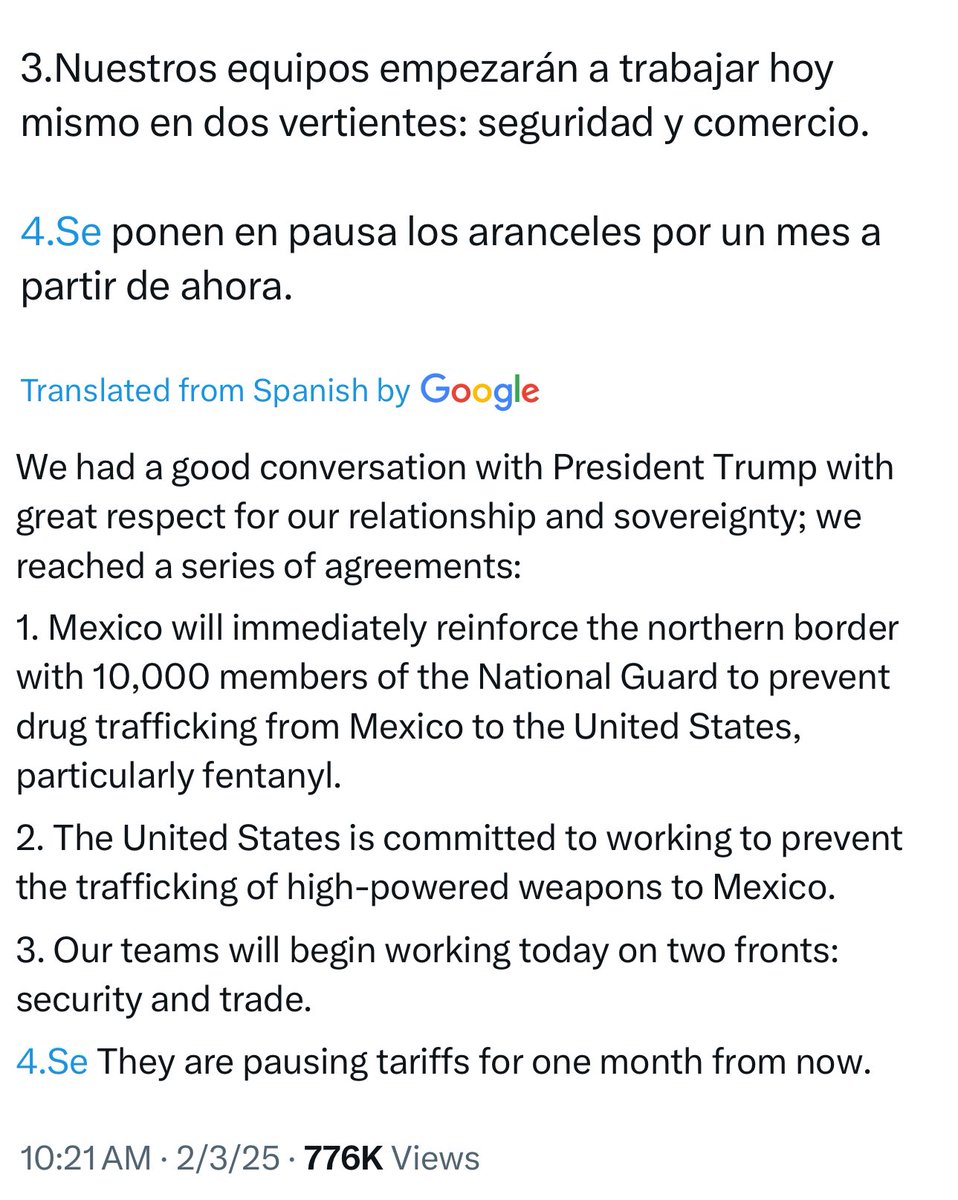 BREAKING: President of Mexico says she will send 10,000 troops to the border to stop the flow of Fentanyl into the U.S. and both she and President Trump have agreed to pause implementing tariffs for one month. https://t.co/RS2X5lnFIY