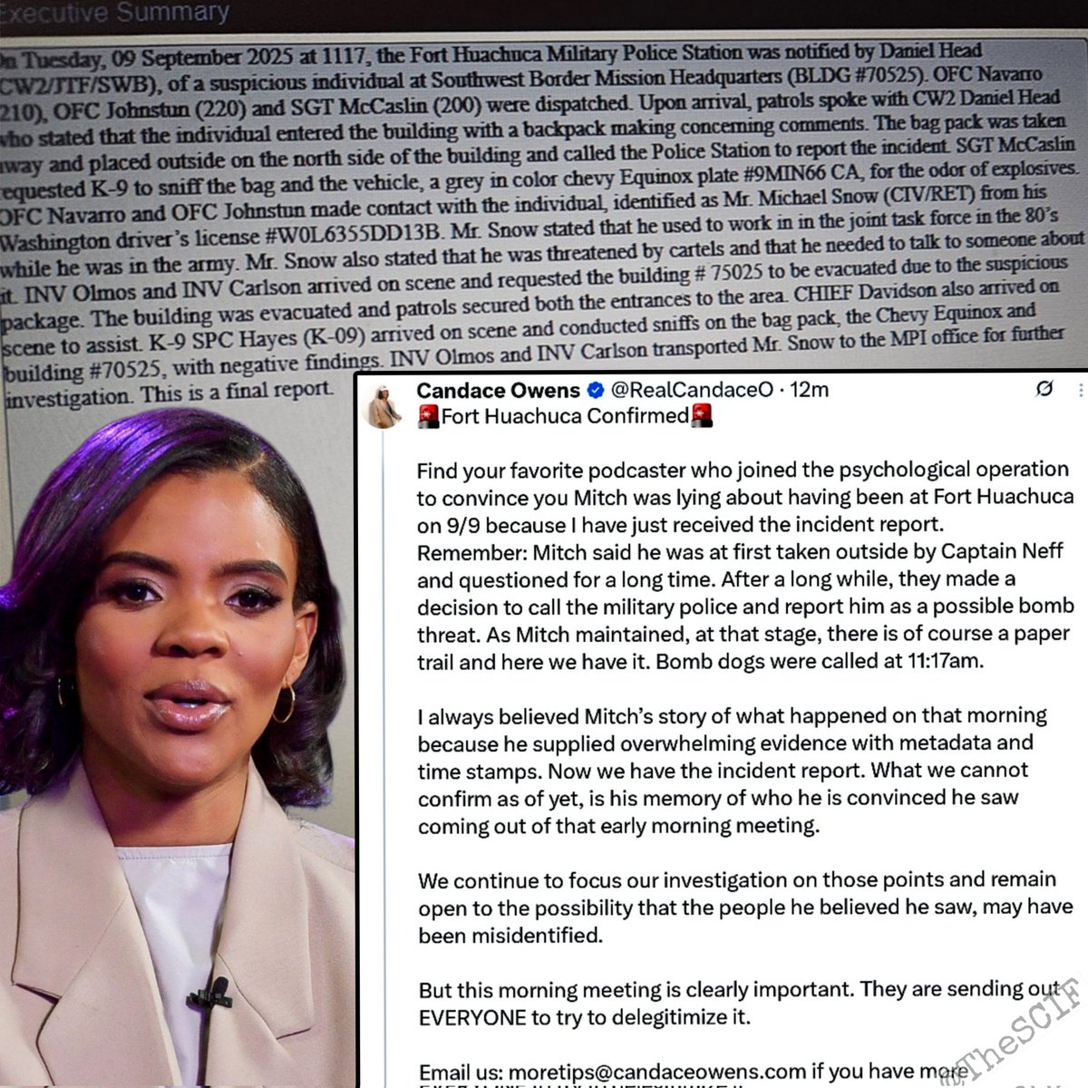 CANDACE OWENS drops bombshell Fort Huachuca Incident in Charlie Kirk Assassination. Witness "Mitch" Vindicated? If you've been following the investigation into the assassination of Charlie Kirk, buckle up—because @RealCandaceO just unleashed a game-changer. Owens shares a verified military police incident report from Fort Huachuca, Arizona, that backs up key witness "Mitch" (full name: Michael Snow, a retired civilian with ties to joint task forces in the '80s). This isn't theory, this is official paperwork confirming Mitch was detained as a "suspicious individual" on September 9, 2025—the very day he claims he stumbled upon a secretive early-morning meeting that could blow the lid off this whole tragedy. Let's break it down from the report itself (attached image for full deets—it's a must-read). The Alert (11:17 AM, Sept 9, 2025). The Fort Huachuca Military Police Station gets tipped off by CW2 Daniel Head about a suspicious guy at the Southwest Border Mission Headquarters (Building #70525). Mitch rolls up in a gray Chevy Equinox (CA plate: 9MIN66 CA) with a backpack, spouting "concerning comments." Head flags it, and the bag gets yanked outside for safety. Mitch, holding a Washington driver's license (WOL6355DD13B), insists he's there because he's been "threatened by cartels" and needs to spill secrets from his Army days in the joint task force back in the '80s. The Response Team Assembles. Officers Navarro (210), Johnstun (220), and Sgt. McCaslin (200) swarm the scene. They chat with Head, who describes Mitch entering the building and raising red flags. The backpack is isolated on the north side, and McCaslin calls in the big guns—a K-9 unit to sniff for explosives. Chief Davidson shows up too, securing entrances while the building gets partially evacuated (Mitch himself requested Building #70525 cleared out due to the "suspicious scene"). K-9 Sweep & All Clear. SPC Hayes and their explosive-detection dog (K-09) arrive, running sniffs on the backpack, the Equinox, and the building. Result? Negative findings—no boom stuff detected. But Mitch isn't off the hook; Investigators Olmos and Carlson haul him to the MP office for deeper questioning. The bigger picture is that Candace calls this proof against the "psychological operation" trying to discredit Mitch. He claims he was first grilled outside by a "Captain Neff" before MPs were called in as a potential bomb threat. Owens emphasizes Mitch's metadata-backed evidence (timestamps, photos?) that places him there. The unconfirmed bombshell? Mitch swears he spotted key figures exiting that mysterious meeting—figures potentially linked to Kirk's assassination. Owens' team is focused on verifying identities, staying open to misidentification, but stresses: "This morning meeting is clearly important. They are sending out EVERYONE to try to delegitimize it." Why does this matter? In the wake of Kirk's murder, whispers of conspiracies involving government ops, border missions, and high-profile players have exploded because people are aware that they are being lied to. "We are winning the psychological war our government is waging against us."Skeptics say it's coincidence or misremembered faces, but this report is the paper trail Mitch promised—no denying he was there, causing chaos. Is this the thread that unravels the truth behind Kirk's death? Or just another layer in the fog? So far, the receipts are being provided. We must stay focused and continue to figure out who is ultimately responsible and involved in the assassination of Charlie Kirk.