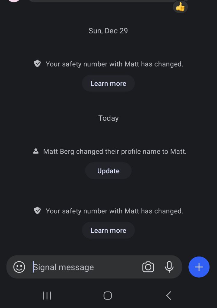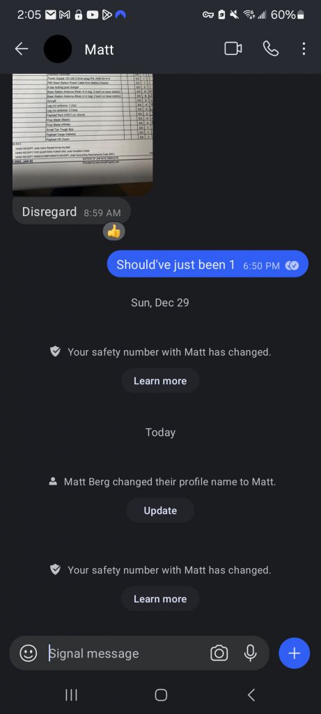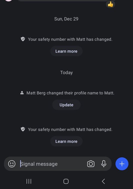 🚨 This is the single most important piece of information in the Vegas bombing 🚨 We cannot trust any of the information contained in the emails or messages from Matt Livelsberger after December 29th when his Signal safety number was changed. For those of you unfamiliar with Signal, it is a peer to peer encrypted messaging app that assigns you a unique safety number based off of your phone and SIM card. It only changes if your Signal account is loaded onto a new phone or SIM. It automatically lets everyone in conversations with you know if your safety number has changed. Matt’s changed on the 29th. All information sent by Matt after the 29th must be treated as misinformation. The emails to Shawn and Sam were sent on the 31st. Why hasn’t this been addressed?