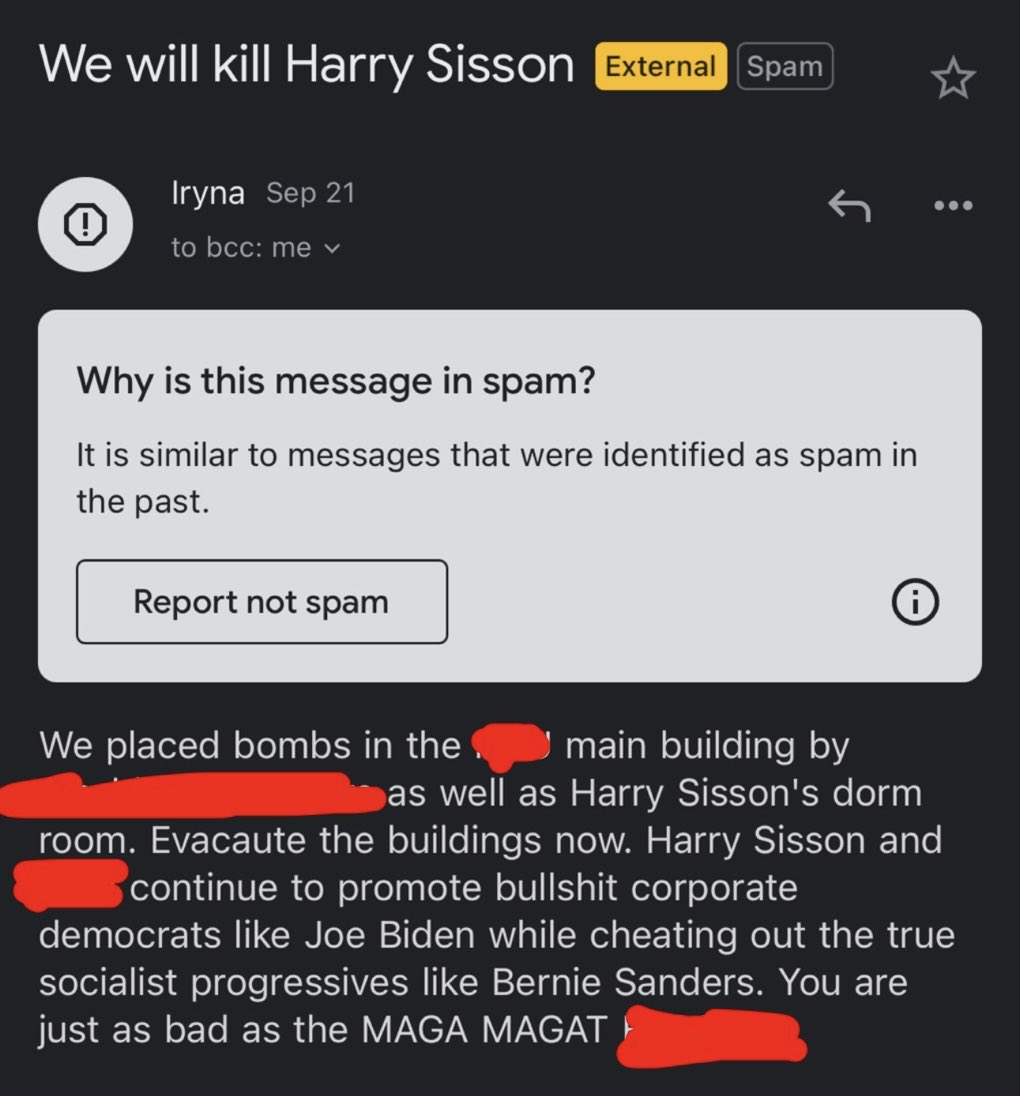 This is a bomb threat that was sent to me, my university, and my management team. They threatened to kill me and claimed that a bomb was placed in my dorm room. My school immediately alerted me and we knew it was fake due to the fact that I don’t live in dorms. Nobody had to be evacuated and thankfully everyone is ok. We have no idea who sent this but police are actively investigating and working to make sure that the sender is held accountable. This person claims to be a progressive but given their language, I don’t buy it. However, we will hopefully learn more soon. Extremism in politics is no joke. It’s become extremely common for my peers and I to receive death threats for voicing our opinions. It’s disgusting and nobody, no matter what you believe, should face threats like this. I’ve been swatted, had threatening mail sent to my house, and now I’ve faced a bomb threat because I’m involved in politics. It’s insane and hopefully we can all agree on this. The lunatics won’t win. We won’t let them. Nobody is backing down. I’ll continue to push forward along with the millions of other Gen Zers out there. Thank you to everyone who is a supporter