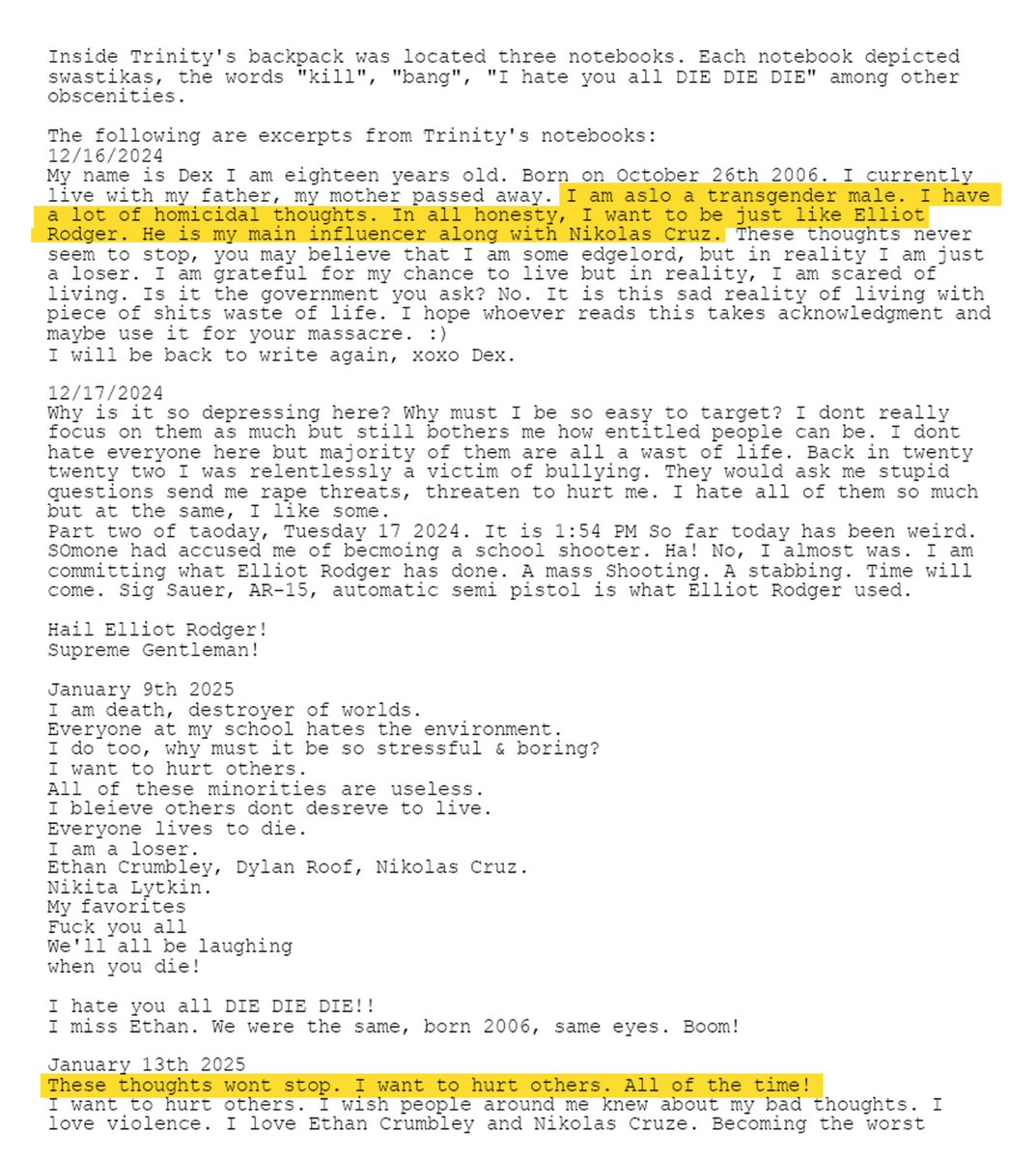 This entry shows entrenched violent ideology and glorification of previous shooters, reinforcing intent and desensitization to mass murder. The shooter knows committing a shooting would be "evil," which makes him want to do it even more. https://t.co/W23t2G4jjU