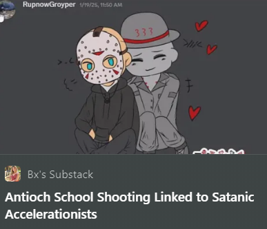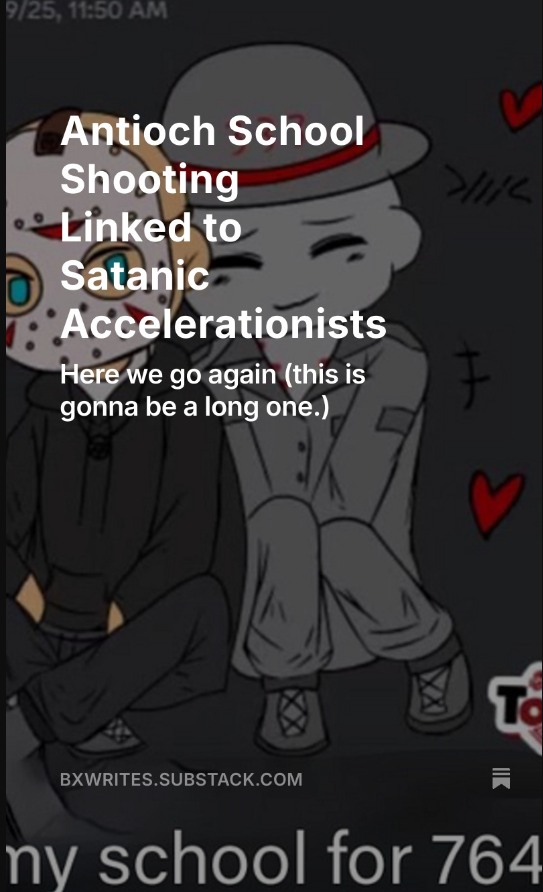 Lots of words, I know. But if you want even more words, rich, expressive detail and a way more in-depth analysis of what I found during this dive, please consider subscribing to my Substack. Thanks for your support, and please, hold your family close tonight <3 /Fin https://open.substack.com/pub/bxwrites/p/antioch-mass-shooting-linked-to-satanic?r=25shzi&utm_campaign=post&utm_medium=web&showWelcomeOnShare=true