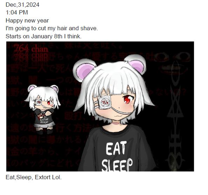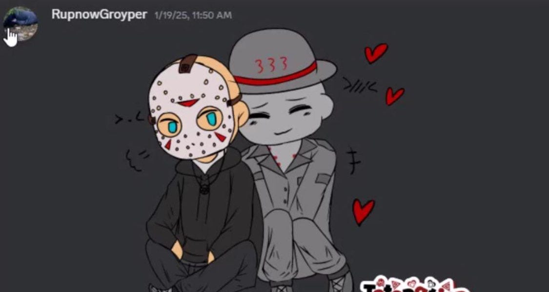 5/ The Discord Server(s) It turns out I was in a Discord server with Henderson, too. He had only made a few posts, a few days before the shooting. First posting an archive of Rupnow's content, then posting an MKU video edit. The Discord server contained people affiliated with 764 and other nasty Com groups. They all started panicking after the shooting and were deleting comments, privating channels like crazy as I watched. Then they coordinated a spamming campaign to pin the blame on Encyclopedia Dramatic and Kiwi Farms. In a message sent just 3 days prior to the attack, Henderson posted an image of a cartoon man in a hockey mask next to "Drill Sergeant Gray" a common Tempel ov Blood icon, along with a Totenation logo (note the pedophilia symbols) and a voice message that said, “Attacking my school for 764 and MKY!”
