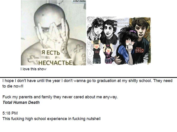 "Survive because hearing a little boy scream I don't want to die is a real pain, ok? 'Well, you heard.' And multiple shots to her head. I... this Russian shit is annoying, lmao. I think I need to do it. No, I can't take any chances, ok? I'm just doing it for fun. I don't know why I am explaining this. You come across this before anything happens, then don't care that much to die. And if I do do something, authorities will probably stop at nothing to read this. So fuck you guys. I just hope I can read this down the road. ANYWAY! I fucking love the idea of being that scary, horrible monster, standing over those poor kids. I scream for help that would be blunt and harsh, an uncaring attitude. A cold blast from reality. To have your craze for something and then that implies horror and to feel that ripping through you. I want people to kneel under me, begging for their lives. I would not bend to your knees. I would rather be in them, before shooting you, or! XD" (9/x)