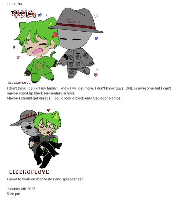 "I recently learned a fact that in the Columbine shooting, Salvador Ramos used his finger to write 'LOL' on the whiteboard on one of his victim's blood. HILARIOUS! It's little things like that that get me really interested in the history of shootings. The words and actions shooters take, and the survivor's reactions? 'Well, you heard!' 'Subscribe to Pewdiepie!' I really don't think I'm going to do anything at this time. I simply have too much to live for. Not necessarily for myself but my family. I am proud of my family and they don't deserve that shame, especially my father, whom I love dearly and I can't bear to have him hear that news. I feel like my mom would have seen it coming due to my rocky past and violent traits. On the other hand, my stepmom would have been quite a sharp energy around me. LMAO. The trace of only who knew my 'FANTASY'. I am begging for help, I am screaming for help. This is not a dance." (20/x)