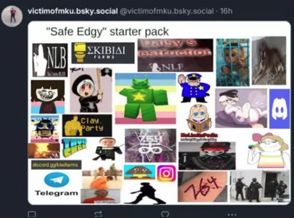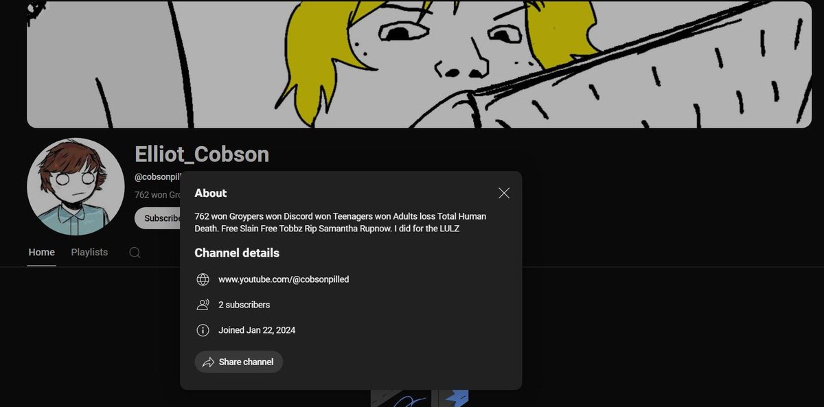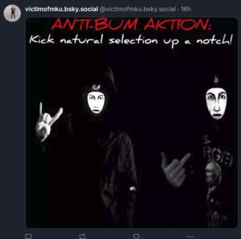 6/ The Social Media Accounts Henderson had a massive social media footprint with accounts on nearly every social media site. He used his new X Account, EndingPoint, to advertise his manifesto and his Kick stream. The people he followed on X confirmed he had extensive connections in Satanic accelerationist circles. He attempted to livestream his shooting on Kick, but wrote in his diary that he couldn’t afford a GoPro and would have to try to stream from his phone. The screen was black the majority of the time, aside from the final frame. On Bluesky, his username was "victimofMKU". On the account, Henderson posted even more references to Liberoflove, MKU/NLM and 764. His YouTube bio read, "Total Human Death. Free Slain Free Tobbz Rip Samantha Rupnow. I did for the LULZ.” Slain and Tobbz are both MKU-linked stabbers and Total Human Death is a slogan adopted by MKU as well.
