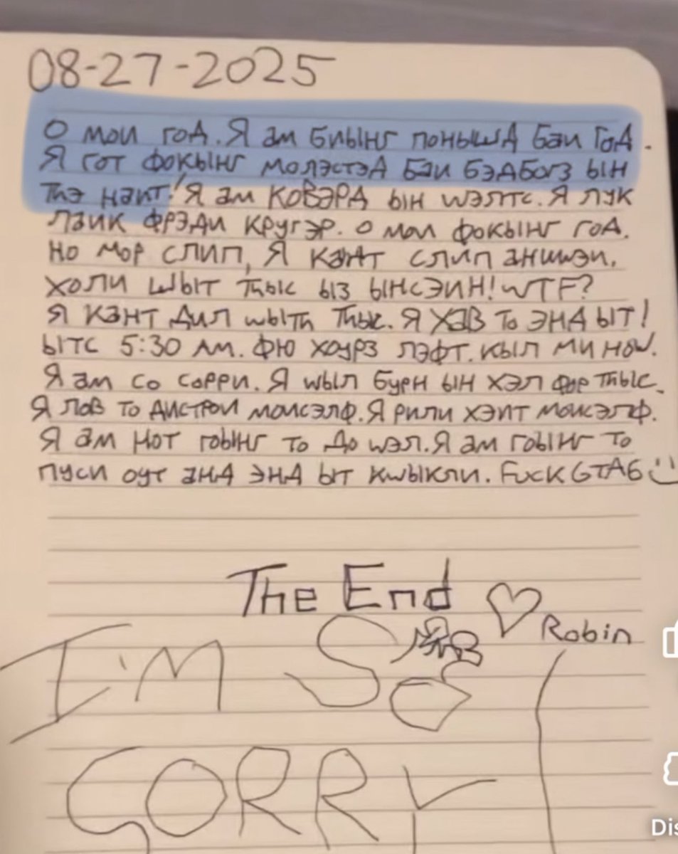 🧵Thread time. Read the entire manifesto translated into English here. I'll be posting every page so make sure you bookmark this. 05.23.2025 ПРОЯВЛЕНИЕ МЫСЛЕЙ (MANIFESTATION OF THOUGHTS) I've had thoughts of mass murder for a long time. I am very conflicted with writing this journal. I need to get my thoughts out without getting put on a watchlist haha. This journal is not going to be organized or easy to read. It will be a brain dump of thoughts. Lately I've been entranced in the 'land of mass shooters.' I have known about these events for years, even at the beginning, maybe a decade. As of late I have really let myself go 'down the rabbit hole' into every mass shooting video. I can't imagine. My interest in school shootings started, I think, in seventh grade. I remember one day I was talking in the hallway. One of my crew and I were with one and another kid. I asked them, "if there was a school shooting, where would you hide?" I do not remember what I asked but it seemed to scare them. They laughed it off, but later told a few adults. (1/x)