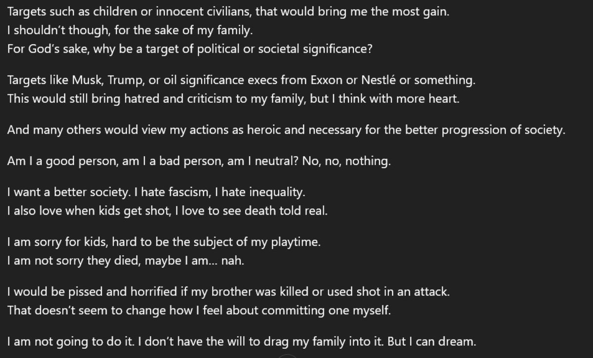 "I don't even know why I do this because I am suicidal. I have wanted to kill myself since I found out what I am and what my life will be. I hate this system of corruption that seems to have no other end. But through fear and murder, as in the case of the health care executives. I think the state should take in America to prevent these tragedies. Are you kidding me? Forgive it and exaggerate it. What these criminals follow rules, haha. But it makes me want to use all the things I've 'outlined' and show them how easy it is to bypass these stupid, backwards rules that only hurt legitimate owners. Anyway, it seems I don't just want to kill people. I have found myself, now and in the past, wishing I could jump into someone's body for a day, commit a horrible massacre, then return to my body with all my memories. I would love to have that experience without having to die or have that horror and humiliation on myself or my family. I guess that's why I enjoy recreating" (14/x)