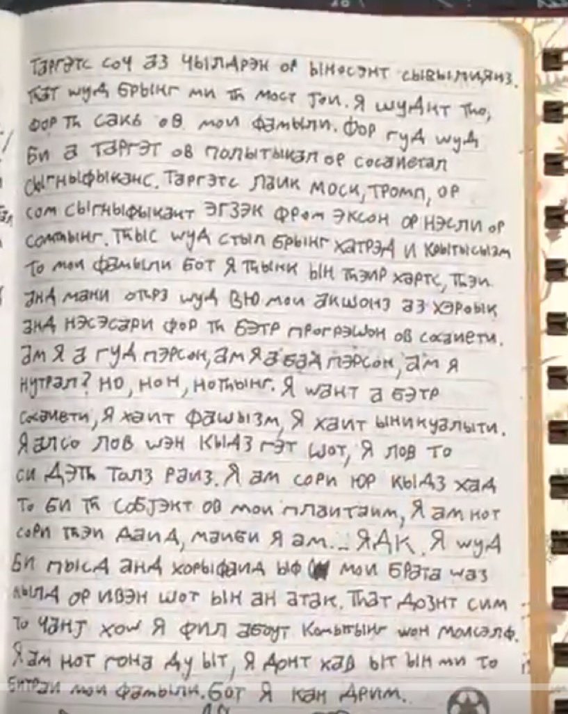 "Hate him poor. I'm not like it, but it should probably go on something that is suspicious because if he or someone else had done it, would be history. I don't think it is enough for law enforcement to step in. Sorry, there is going to be a lot of mistakes. I'm tired and this writing is killing my hand and stupid. I'm writing in Cyrillic text, in English, um, phonics. I also sprinkle some Russian words I assume, with terrible grammar and spelling. I've been learning Russian for many years but never really learned. I just assumed that I could write in Cyrillic. It is inconsistent, but it works for me, lol. For a long time, since I got access to the internet, I have been seeking out gore and violence. I have been fascinated with firearms and weapons since I was little. I consider myself a pretty knowledgeable person, not just on firearms, lol. I definitely had big ego and a superiority complex. I assume the reason I have let myself go lately is my fear of health complications. I have been smoking and vaping." (4/x)