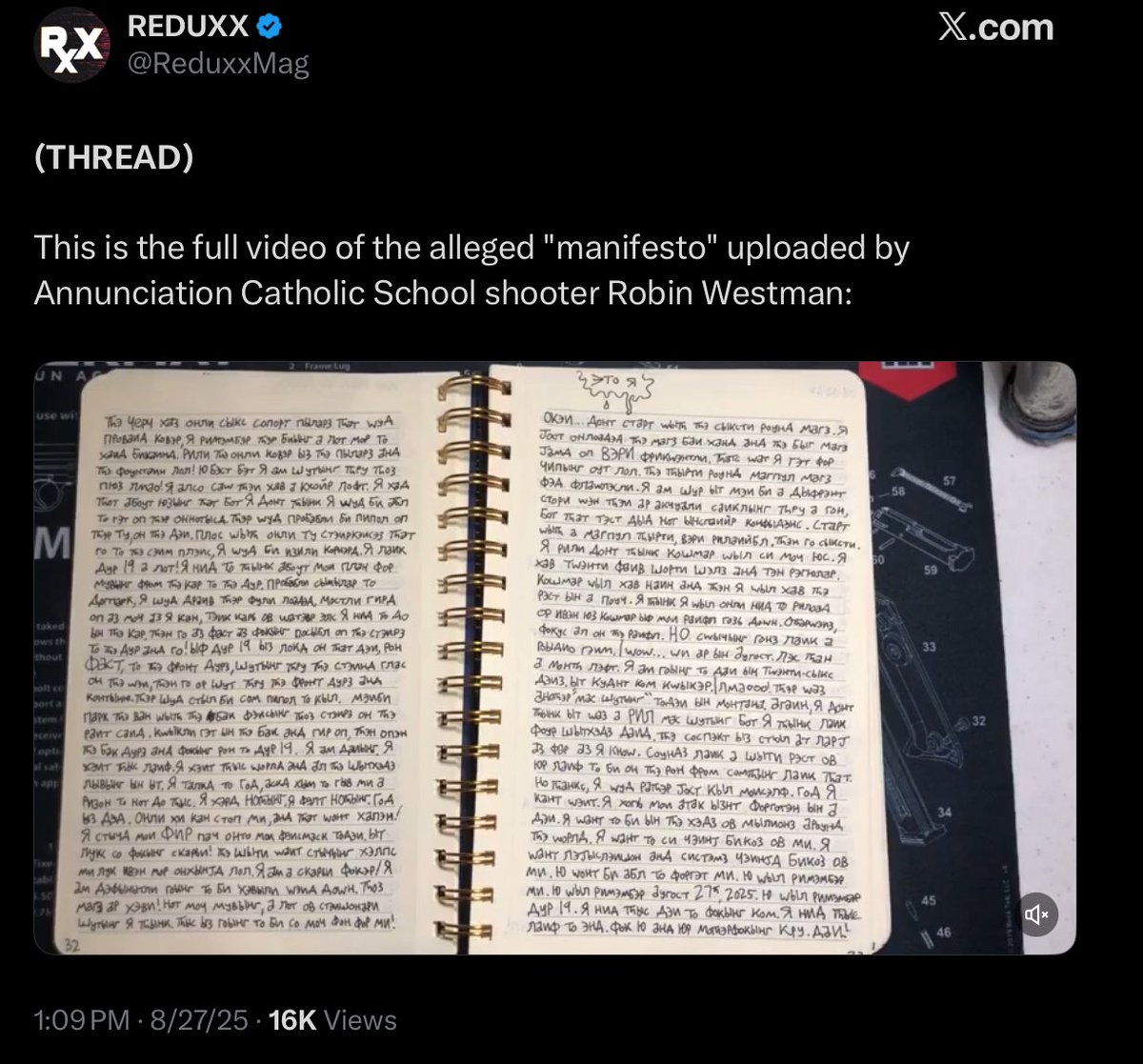 The full tranifesto/manifesto from the Annunciation Catholic School shooter in Minneapolis. This was posted on HIS YouTube channel. https://t.co/rvQw42bO2A