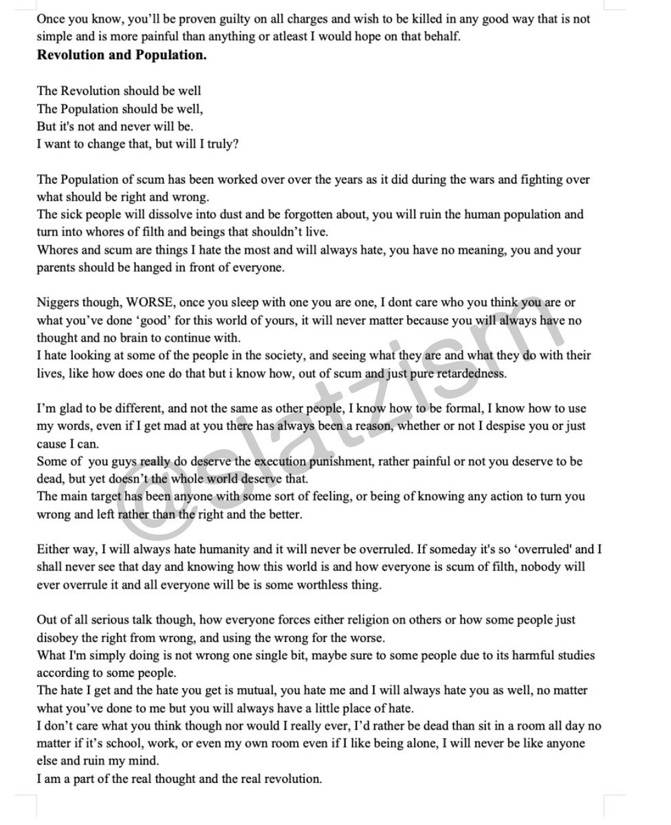 "In regards to my motivation behind the attack. I can't really put my finger on a specific purpose, but it definitely wants to be for racism or white supremacy. Those fools seem to always get cloned in a while. I don't really like being around people of color. I don't give a enough of a shit about them. To take my life over them. If I did carry out something, my motivation would most likely be against Filipinos. Jesus. I hate those entitled, penny-sniffing g**ks. FREE PALESTINE! I think my dream would be to shoot up a mall or a high school, but that is probably unrealistic due to security warnings in 2025. I don't want to do it but it's a must. I do it to please myself. I do it because I'm sick. I'm twisted. I want children to scream for help. I want ladies praying for their lives. I want men to think they can stop me, only for me to stop them dead in their tracks." (17/x)