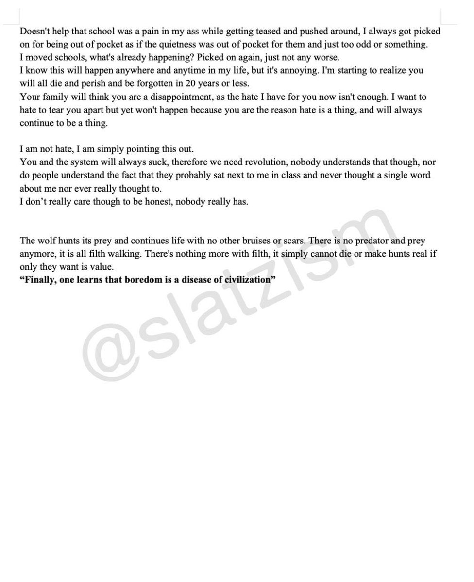 "I have a fascination with one man in particular: Adam Lanza. What a fucking freak, haha. Sandy Hook was my first, I assume, exposure to school shootings. I can remember vividly when I heard about it. I remember sitting on the computer doing homework, I assume, fourth grade. We were just quietly doing work on our computers when a little notification popped on screen saying '20 children and six adults shot and killed at Sandy Hook Elementary.' It hit me in the gut. I remember not really knowing what that meant. I don't remember my classmates or teachers' reactions, but I know that the image of that little notification popping up has always stuck with me. For some reason, I can't get it out of my head. 'What a perfect event.' I love thinking about what it was like to be in there on that day. What it was like to be him, the kids in the rooms and teachers. An image has always been there of that event from the shooting which has stuck with me with the." (8/x)