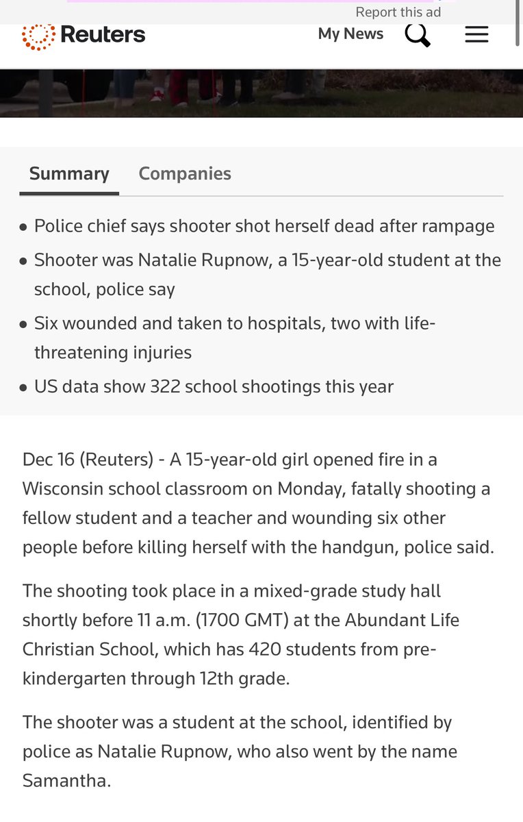 Reuters has now further confirmed that a 15 female student named Natalie “Samantha” Rupnow is behind the shooting. If you were following this thread, you got the news a clean 5 hours early. Congrats. https://t.co/yeGTFzcvbw
