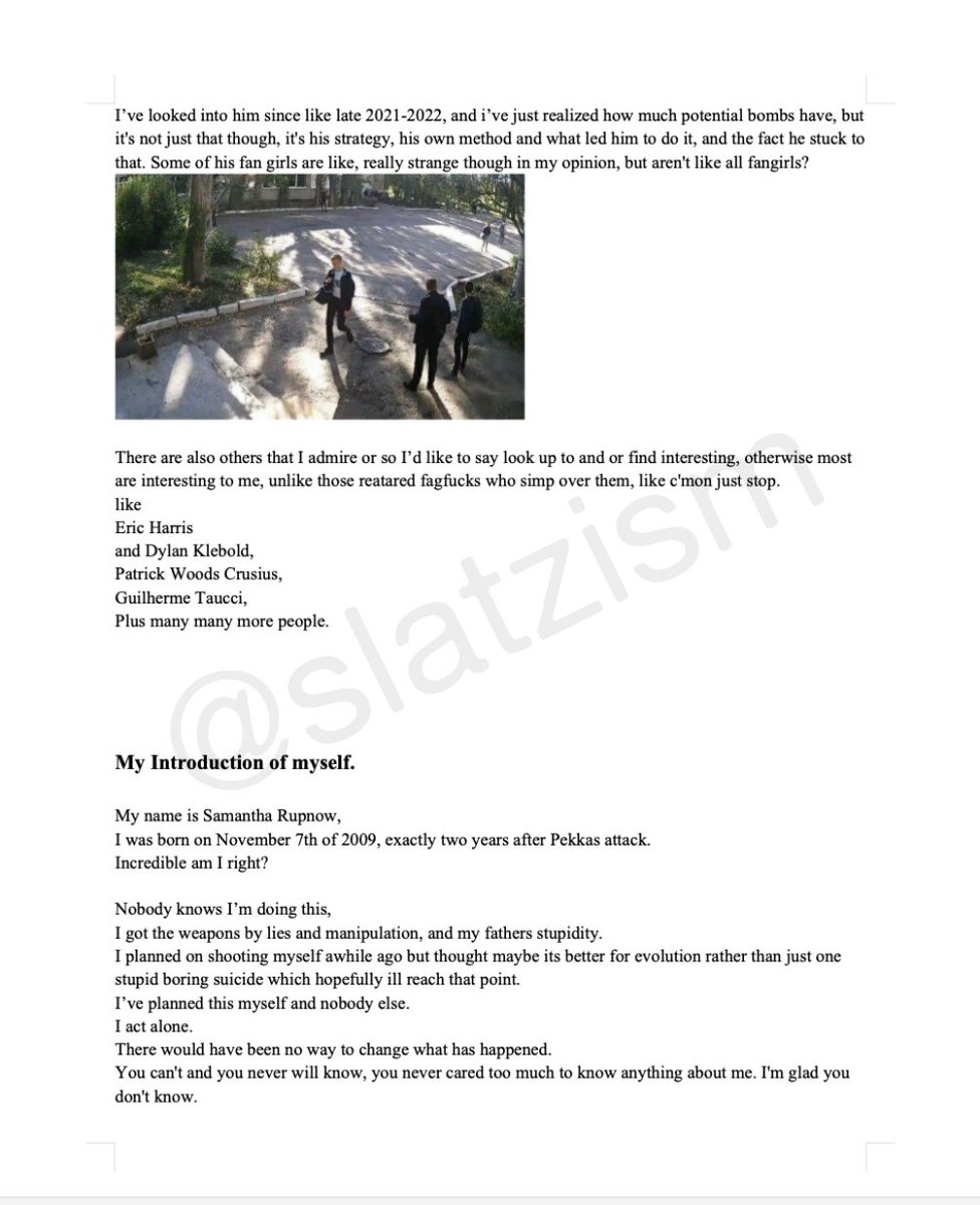 I have made contact with the alleged boyfriend of the Wisconsin shooter. He has very graciously provided me the full manifesto, which I verified by having him screen record himself opening it from a direct link the shooter sent to him via WhatsApp. I told him I would do my best to dispel some of the misinformation and present things as truthfully as I was given them, and I will hold myself to that. - Her boyfriend knew her as Samantha Rupnow. - She also went by a different name (one which was also feminine), but adopted the name "Samantha" and this was the name her boyfriend says she had on her school identification card. - She was a student at Abundant Life. - She was born on November 7, 2009. - She was born female and was not transgender. Her boyfriend was born male and is not transgender. - Her manifesto was titled "War Against Humanity." - Her manifesto is 6 pages long. - In her manifesto, she spoke about having extremely difficult relationship with her parents, who she referred to as "scum." - She also claims her family didn't love her or want her, and expresses feeling like the "wrong child" of her family. - She says she had planned to commit suicide a long time ago, but felt committing a shooting was “better for evolution rather than just one stupid boring suicide.” - She expresses deep admiration for Pekka Eric Auvinen, Arda Küçükyetim, and Vladislav Roslyakov. - She offered particular praise for Küçükyetim, who was a Turkish neo-nazi who committed a mass attack in Eskişehir earlier this year, and stated he was an inspiration to her. She calls him “an ultimate saint.” - She expressed that she got the weapons to commit the attack through "lies, manipulation, and my father's stupidity.” More to come shortly. I will make some screenshots of the manifesto. In the interim…. Her boyfriend says the photo that is making the rounds is not how he remembers her, and believes it was somewhat edited “to make her look worse.” He provided me a photo of her in the same t-shirt and room.