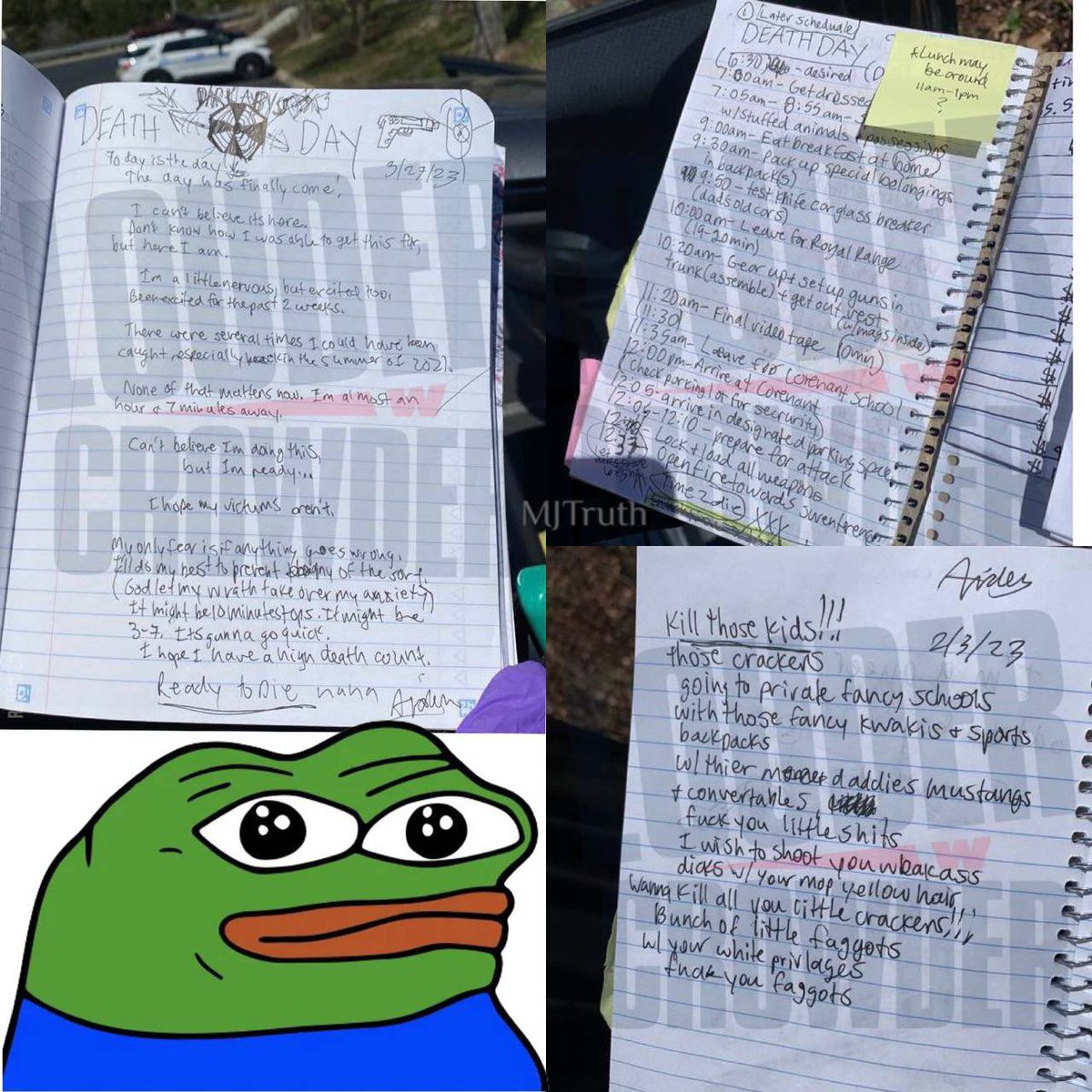 Trans Nashville Shooter “Death Day” Manifesto Leaked I transcribed it for everyone… PAGE 1 DEATH DAY 3/27/23 Today is the day. The day has finally come! • I can't believe it's here. Don't Know how I was able to get this far, but here I am. • I’m a little nervous, but excited too. Been Excited for the past 2 weeks. • There were several times I could have been caught, especially in the summer of 2021 • None of that matters now. I’m almost an hour & minutes away. (17) 🤔 • Can't believe I m doing this, but I'm ready... I hope my victims aren't • The only fear is if anything goes wrong, I’ll do my best to prevent any of the sort. • (God let my wrath take over my anxiety) • It might be 10 minutes tops. It might be 3-7. It's gonna go quick. • I hope I have a high death count. Ready to die. Haha (signature) PAGE 2 DEATH DAY * Lunch may be around 11am-1pm? (6-30) desired 7:00am - Get dressed 7:05am - 8:55am - ???? w/stuffed animals & possessions 9:00am- Eat breakfast at Home 9:30am- pack up special belongings in backpack(s) 9-50- test knife cor glass breaker (dad's old cors) 10am- Lave for Royal Range (19-20min) 10:20am- Gear up & setup guns in trunk (assemble) get out rest (w/mags inside) 11:20am- Final Video Tape (10 min) 11-30 11:39am- leave for Covenant School 12:00pm- Arrive at Covenant check parking lot for Security) 12:05- arrive in designated parking space 12:05-12:10- prepare for attack 12:2?- Lock and load all weapons 1233- Open fire towards SWentrance Let massacre begin. Time 2 Die xxx PAGE 3 2/3/2023 K*ll Those K*ds!!! Those Cr*ckers going to private fancy schools with those fancy kwakis & Sports backpacks w/their daddies mustangs & convertables f*ck you little sh*ts I wish to sh**t you weakass d*cks with your mop yellow hair, wanna k*ll all you little cr*ckers !! Bunch of little fa**ots w/your white privileges. F*ck you fa**ots MY THOUGHTS: It’s very obvious why they didn’t want this released… doesn’t fit any of their narratives. On Page 1, the shooter says, “There were several times I could have been caught, especially in the summer of 2021”— What does that mean?? Also on page 1, the shooter says “I’m almost an hour & minutes away. (17)” Weird right? Also, look at the sticky note on Page 2– The handwriting appears to be different… PG2 shooter talks about a final video tape?? Are they withholding a tape the shooter made??? Article https://thepostmillennial.com/breaking-manifesto-of-trans-nashville-school-shooter-leaked