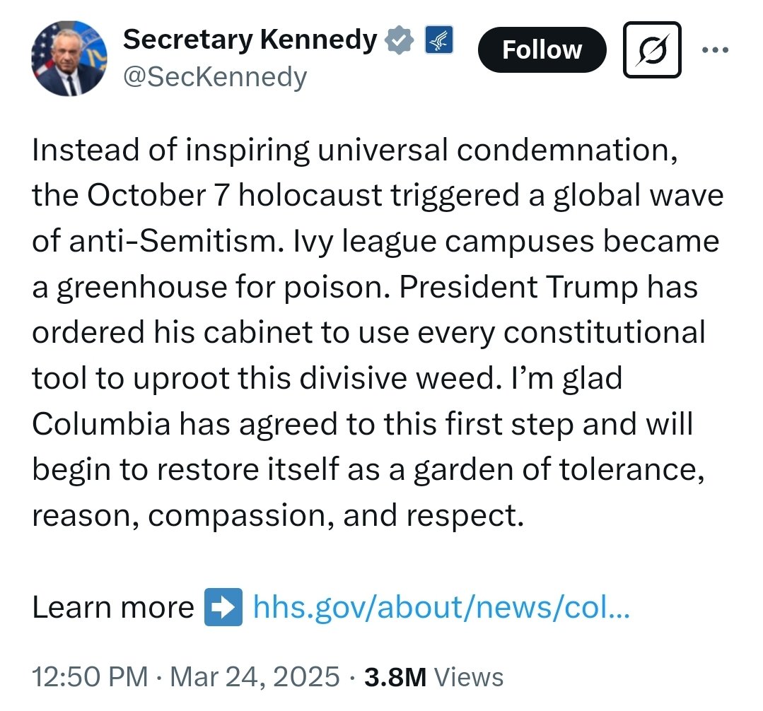 🧵10/ What does "antisemitism" on college campuses have to do with vaccines & eating healthy? Why are resources of the Dept of HHS being brought to bear on a free speech issue? What does israel have on him? https://t.co/DrB7kEbVkI