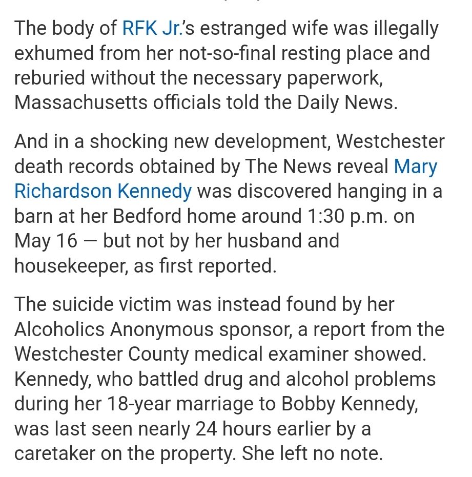 🧵2/ In the article, we learn that RFK owed his dead wife's family nearly $300k, so it's weird that he'd open himself up to more expensive litigation by not getting a permit. As a lawyer, he also clearly knew better, but took the risk anyway. We also learn that it was an Alcoholics Anonymous friend who discovered the body--not RFK or the housekeeper as originally reported. This is immediately important. (cont)