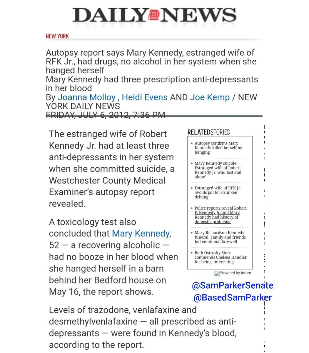 🧵3/ Plot Thickens: Mary Kennedy was a known alcoholic, but in the bombshell toxicology report, it was revealed she had no alcohol in her system and her anti-depressant levels were at the normal dosage. Who ever heard of an alcoholic NOT getting drunk or taking extra pills in a suicide attempt?