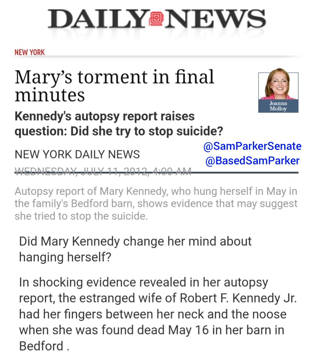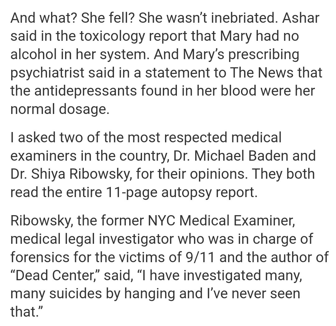 🧵4/ BOMBSHELL: MARY KENNEDY TRIED TO STOP THE SUICIDE The autopsy showed her fingers had been wedged between the rope and her neck--like someone would try to do to escape the noose! Furthermore, if you think "Maybe she wanted to remain lucid and in control"--a "rational" suicide--well, she didn't leave a note either! Taking the toxicology report, the autopsy report & the lack of a note together--1 nationally renowned medical examiner remarked who had been in charge of 9-11 victim forensics, and who had investigated many suicides by hanging, remarked "I've never seen that."