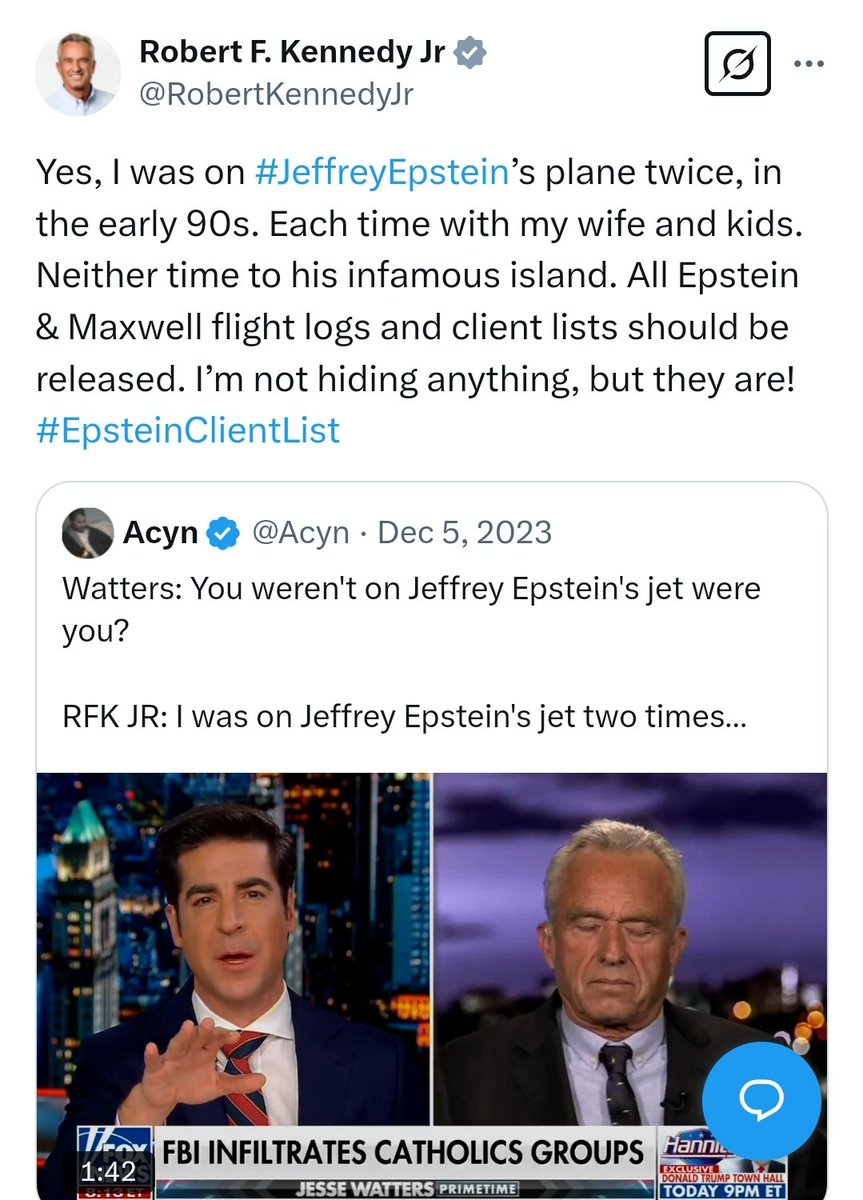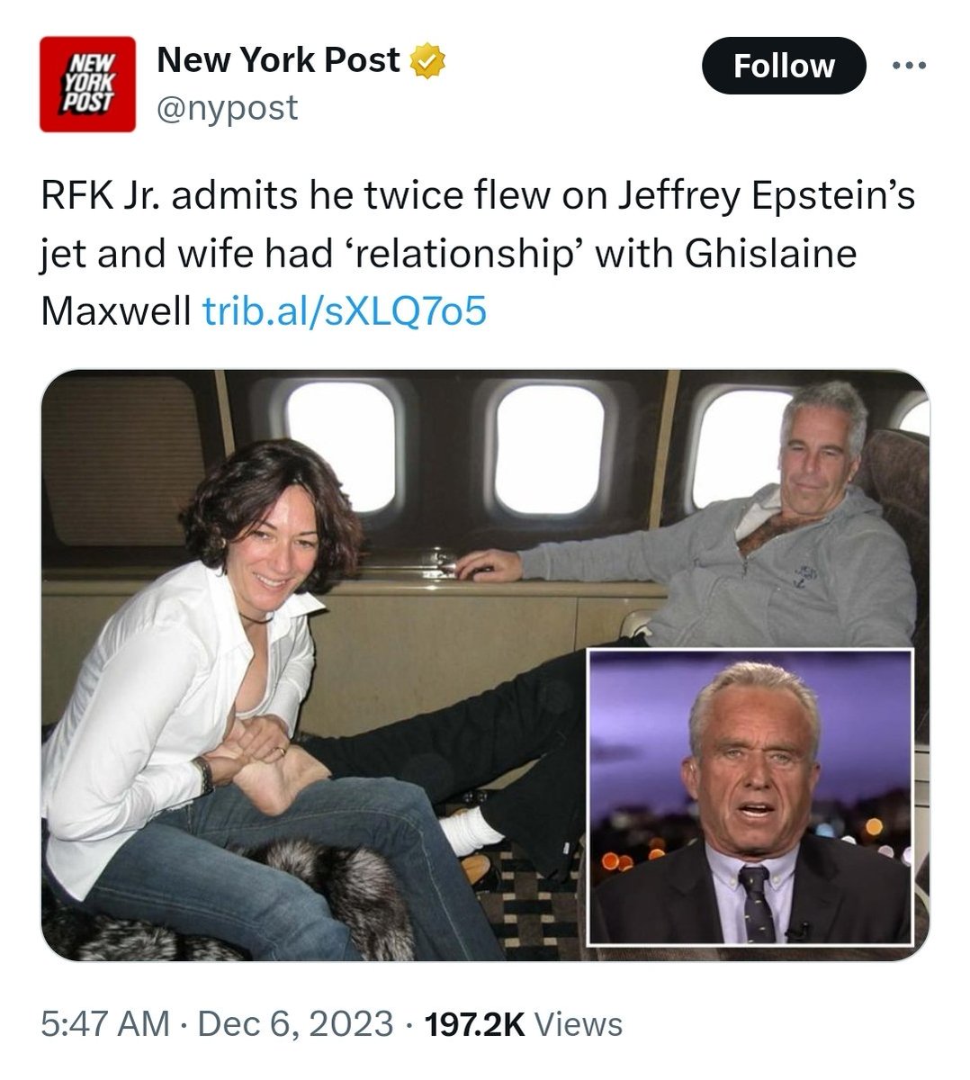 🧵5/ RFK Jr. Admitted that his wife had "some kind of relationship with Ghislaine Maxwell" going back to at least 1993. And they flew on Epstein's plane multiple times. RFK's name was also in Epstein's black book. Who has "some kind of relationship" to a child sex trafficker close enough to get private jet trips?