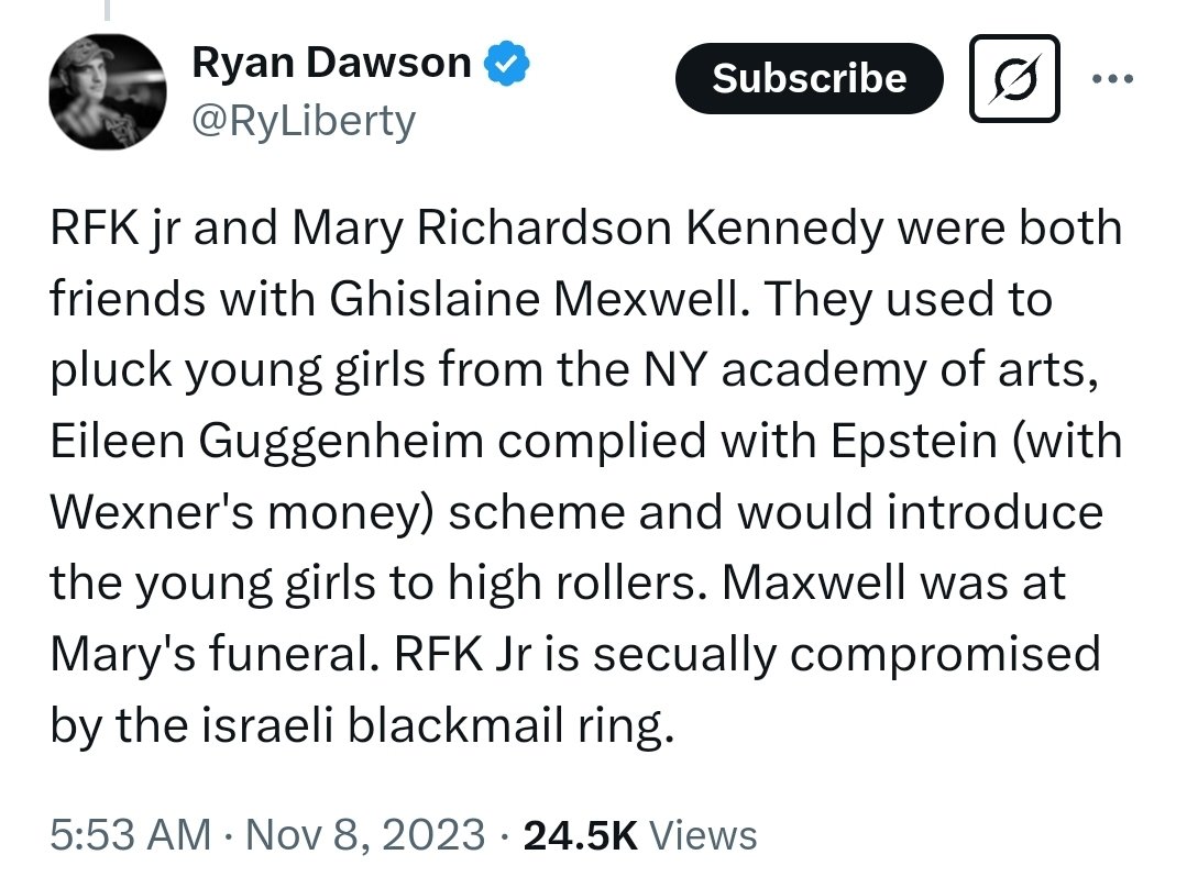 🧵6/ @RyLiberty, an expert in Epstein research, reports that RFK Jr. & Mary both had a cozy relationship with the Epstein/Maxwell sex ring and that RFK is being blackmailed. https://t.co/G5nb7wY0P5