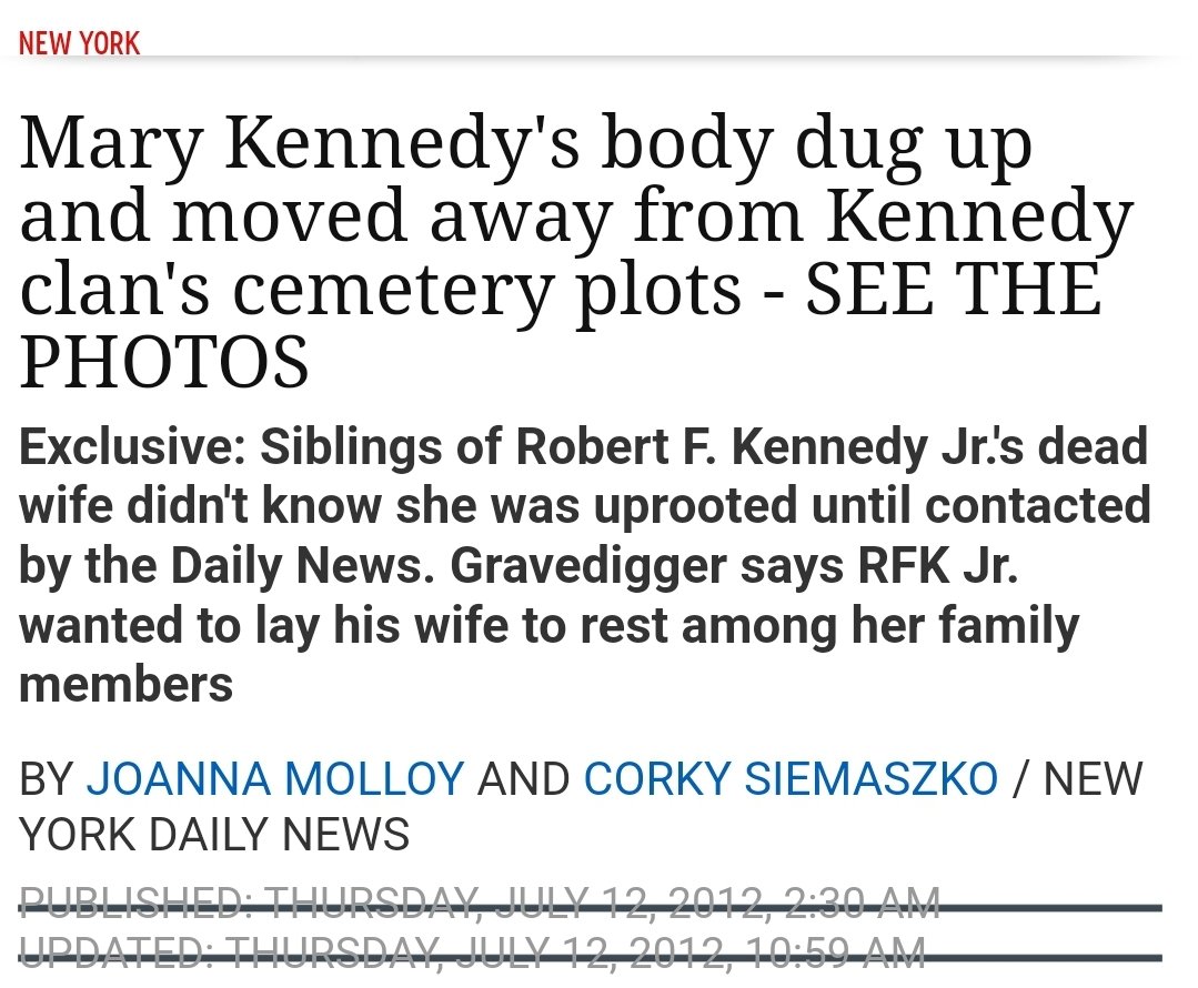 🚨🧵1/ REWIND: RFK Jr. ILLEGALLY MOVED DEAD WIFE'S BODY IN 2012. Possible blackmail implications? What made this odd at the time is that he'd recently won a long & expensive court battle to be able to bury her in that original location, but then he undertook the illegal & controversial action to move the body. This could have opened him up to more legal battles when he already owed her family nearly $300k in legal bills.