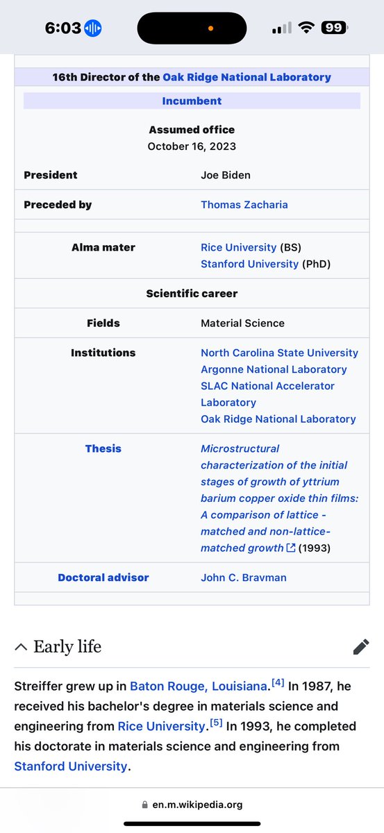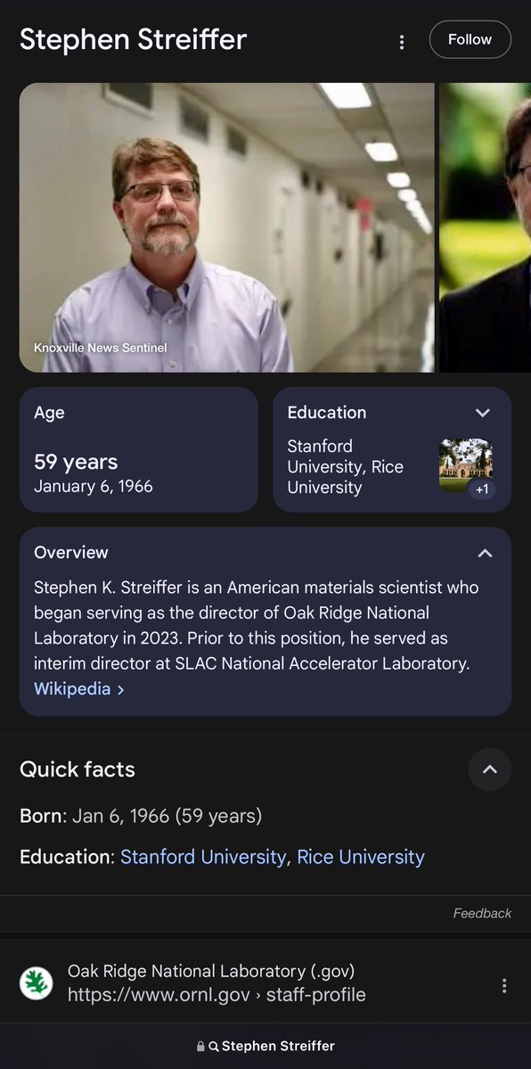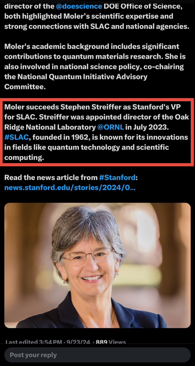 Welp, isn’t this just an un-fucking-believable Cohencidence™️. There’s Oak Ridge National Laboratory, which is run by BATTELLE, again. Who could’ve POSSIBLY predicted this? Perhaps we should speak to Kathryn Moler, Stanford’s Vice Provost, Dean of Research and (as of September 2024) VP for SLAC. Or better yet, we’ll get in touch with Stephen Streiffer, the recently-appointed DIRECTOR of the Oak Ridge National Laboratory (July 2023), whom Kathryn Moler just replaced as Stanford’s VP for SLAC.