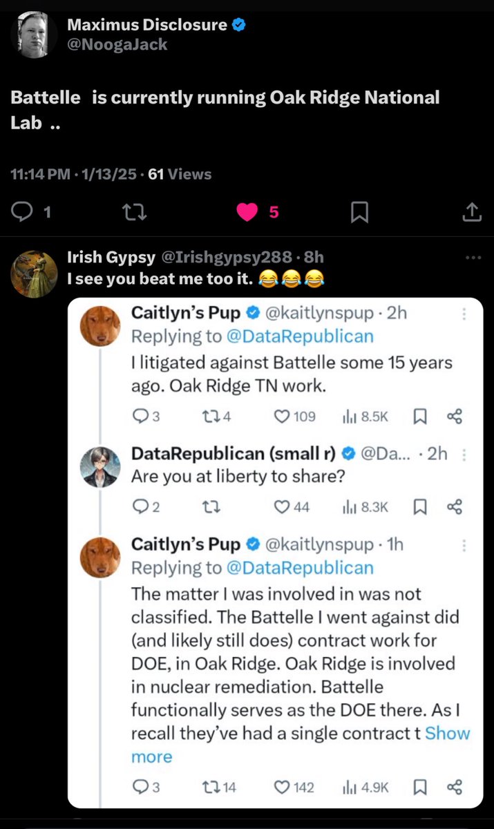 💥MASSIVE PROPS go out to @NoogaJack and @kaitlynspup on the Battelle and Oak Ridge National Laboratory deets. And to @DataRepublican on the Battelle assist! Thanks, team!🇺🇸🫡 https://t.co/MdenmunjSb