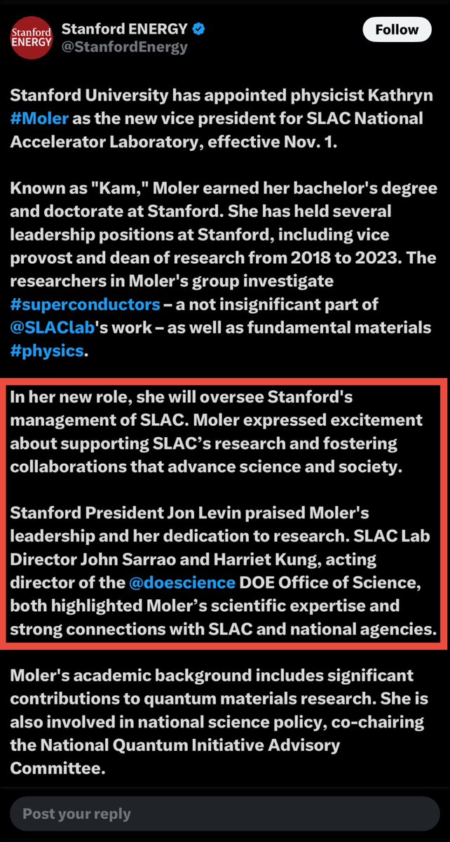 It’s interesting that you mentioned Battelle does contract work for the DoE at Oak Ridge National Laboratory in Oak Ridge, TN, @kaitlynspup. Because HARRIET KUNG, the Acting Director of @doescience, had some very high praise for Kathryn Moler, right after Moler was appointed to replace Stephen K. Streiffer as the new VP of SLAC in September 2024. Stephen Streiffer resigned from SLAC and became the new Director of Oak Ridge National Laboratory on October 16, 2023. Interesting timing too, that appointment date. Just 9 days after the grotesque 10/7 attacks that Israel Policy Forum and its CEO, David Halperin (Mark Halperin’s brother), helped plan and execute. I’m sure that’ll never be relevant again either.🫡
