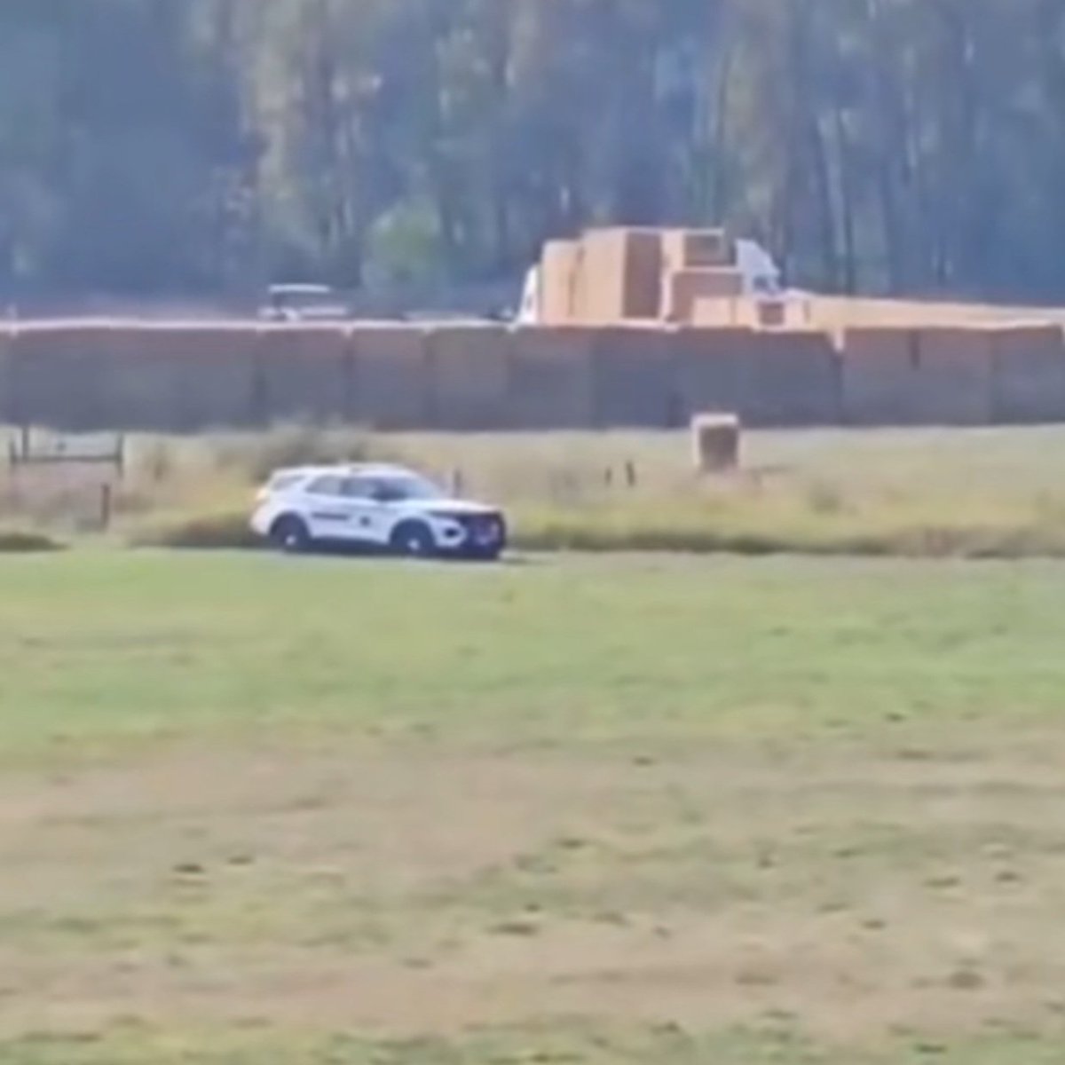 The RCMP reinforcements have gathered in the field next to the CFIA cull area. An additional fence surrounding the tall hay wall can be seen covered with a tarp of some sort. There are RCMP and surveillance equipment manning the perimeter as if it's a military base or something similar. ๐ท Blake Roberts