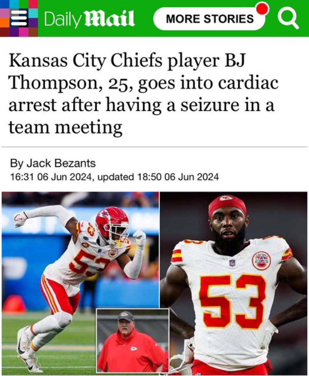 🚨Nothing to see here… 25 year old Kansas City Chiefs player BJ Thompson had a seizure and suffered a cardiac arrest during a team meeting. He’s now in stable condition at hospital. https://t.co/nnna4MbLkb
