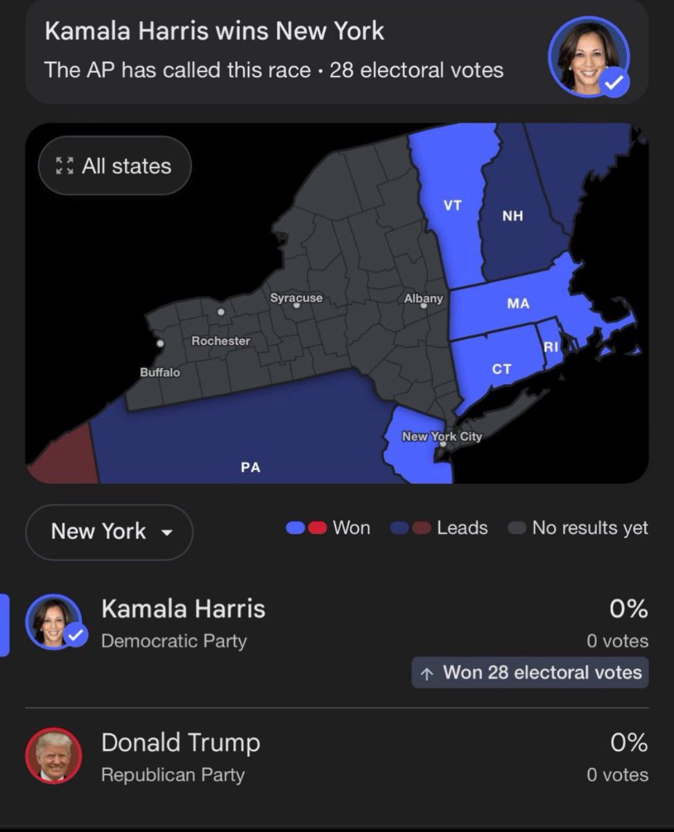 ⁉️How is this not election interference? AP has called the race in NY for Kamala with 0% reporting. Meanwhile there are still people in NJ waiting 4 hours to vote without being given a reason for the delay. https://t.co/0Gba3H41mr