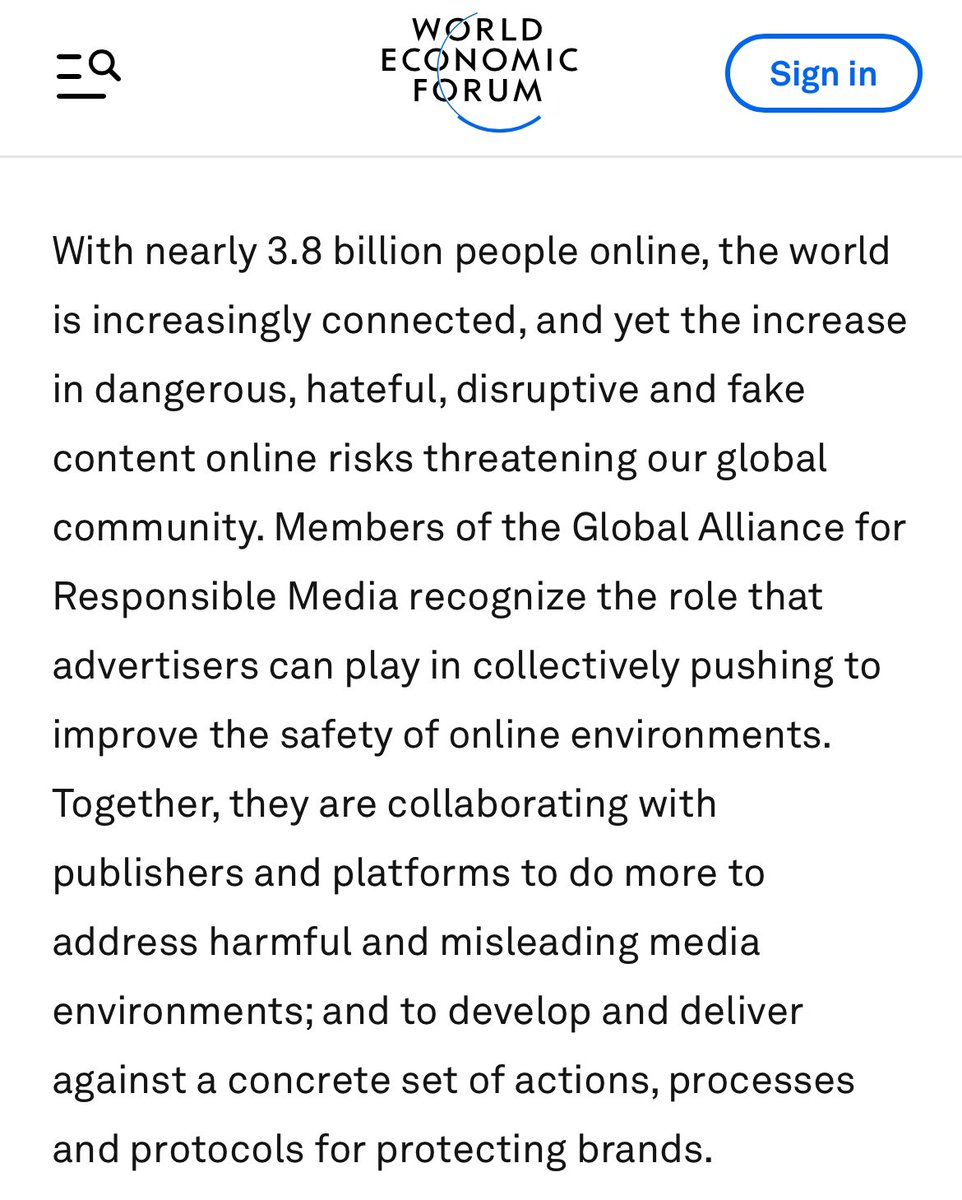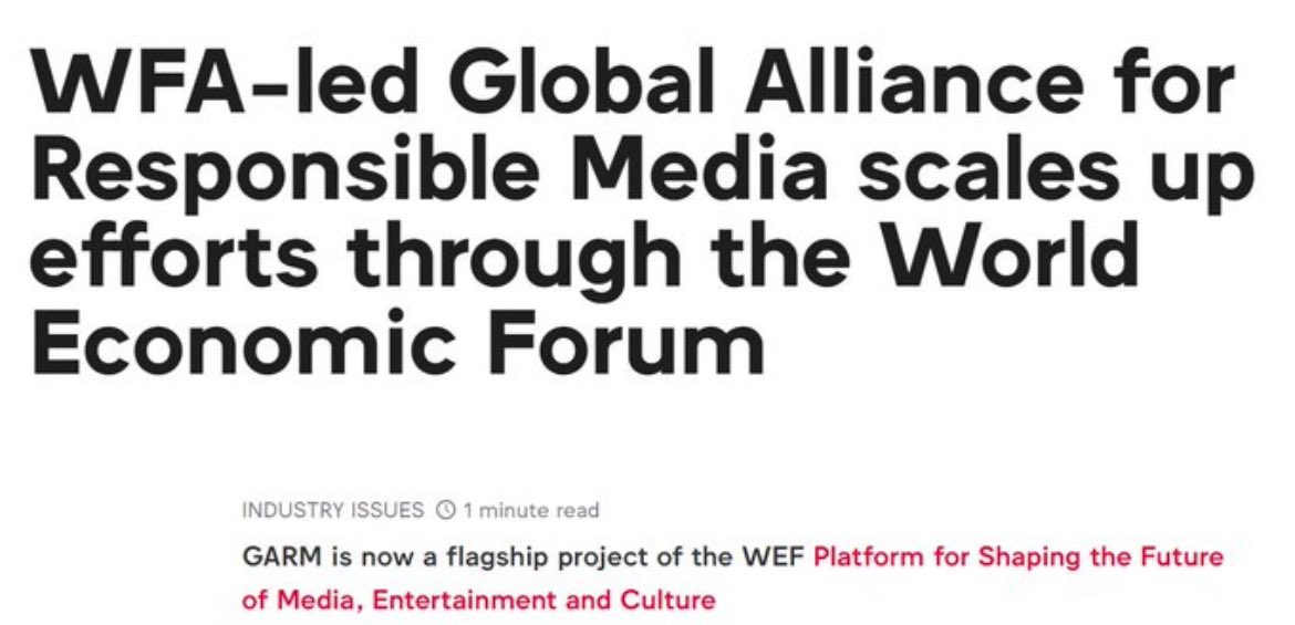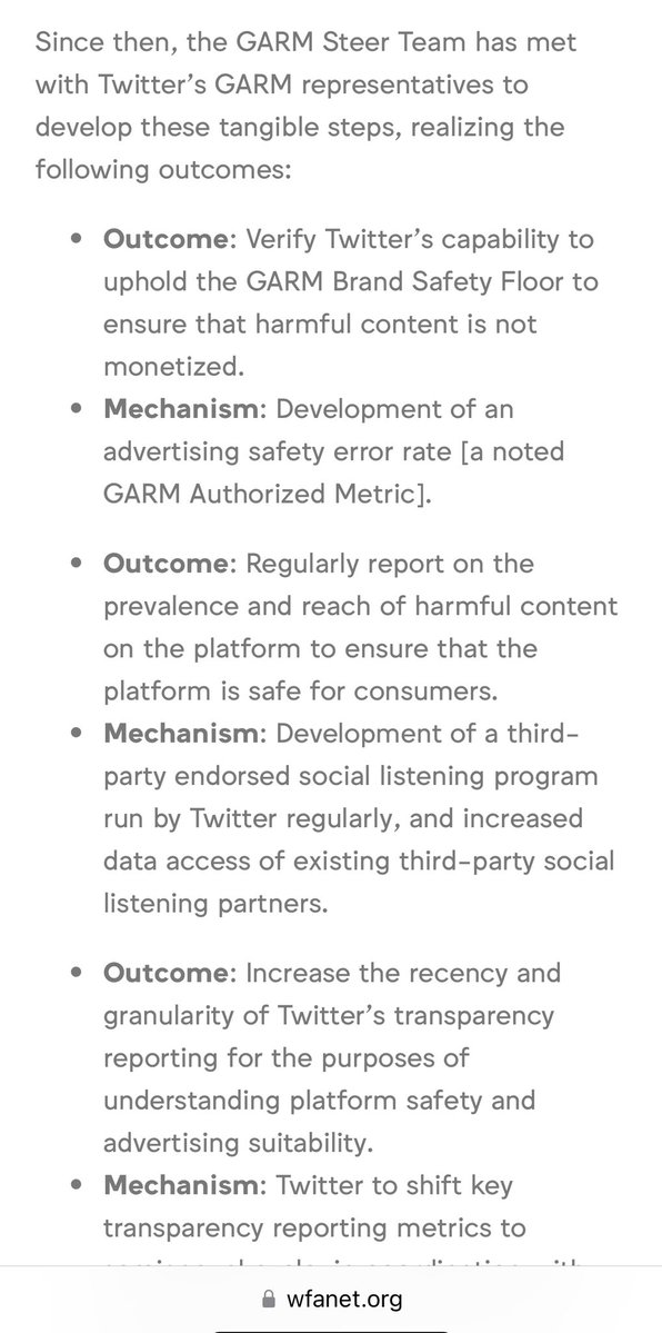 ⁉️X has rejoined the WEF’s Global Alliance for Responsible Media.⁉️ This is potentially much worse than losing our ‘Likes’. GARM achieves its objectives of ‘brand safety’ through censorship and demonetization. Below were the mechanisms they expected previously of Twitter at the end of 2022. https://wfanet.org/knowledge/item/2022/12/19/Twitter-announces-its-acceleration-agenda-with-GARM-to-answer-brand-safety-needs The GARM Steer Team has met with Twitter’s GARM representatives to develop these tangible steps, realizing the following outcomes: •Outcome: Verify Twitter’s capability to uphold the GARM Brand Safety Floor to ensure that harmful content is not monetized. •Mechanism: Development of an advertising safety error rate [a noted GARM Authorized Metric]. •Outcome: Regularly report on the prevalence and reach of harmful content on the platform to ensure that the platform is safe for consumers. •Mechanism: Development of a third-party endorsed social listening program run by Twitter regularly, and increased data access of existing third-party social listening partners.