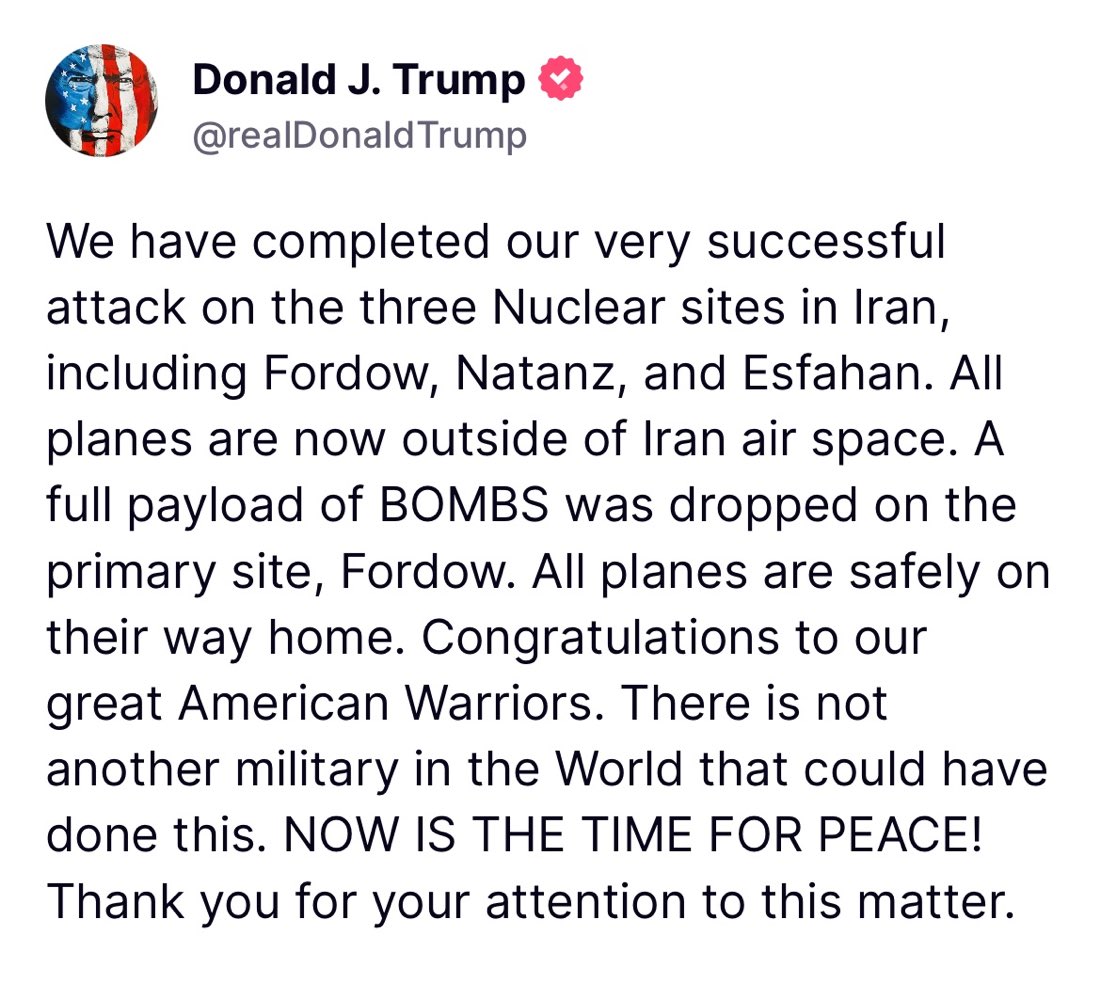 It’s done. President Trump ordered the bombing of Fordow, Natanz and Esfahan in Iran. I really don’t want an eventual ground war so I pray these strikes were a success, that they’ll result in a peace deal and that our warriors stay safe tonight while repelling any Iranian attack. https://t.co/QSjilH6JJF