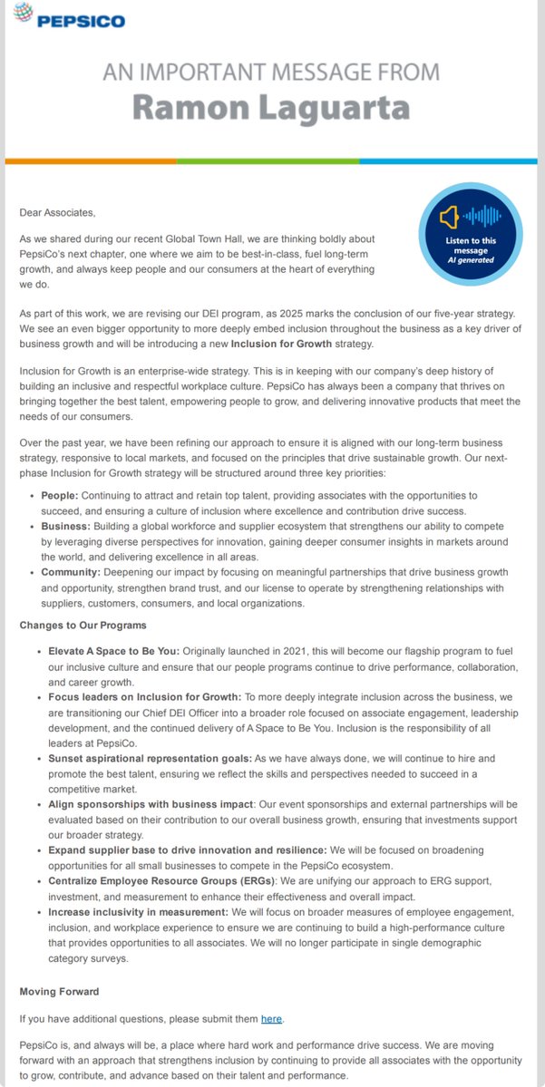 MASSIVE news: I contacted PepsiCo to let them know that I planned on doing a story about their woke policies. When I contacted them, they were ready to make some BIG changes. I can now exclusively tell you what’s changing: • @PepsiCo will no longer have a DEI Officer. • PepsiCo will no longer have a DEI team. • PepsiCo will END DEI representation goals. • PepsiCo will no longer participate in the woke @HRC CEI social credit system survey. Woke trans agenda activists at the HRC are losing influence and power by the day. • They will END ALL DEI trainings. • ALL PepsiCo sponsorships must align with their business going forward. • Instead of supplier diversity, PepsiCo is now focused on growing their small business supplier base. • There will now be centralized management of ALL employee groups to ensure that their activities align with the core business. • Going forward their strategy will be about GROWTH and how they drive growth to the business. I have to give their executives major credit for making these changes because these are some big changes. You can see the email that just went out to employees below. It’s corporate speak but what I wrote here is accurate as to their actual full changes. Keep in mind, this doesn’t just affect Pepsi. PepsiCo owns the following brands: Gatorade, Quaker Oatmeal/Cereal, Chewy Bars, Starbuck’s coffees in glass that’s sold at grocery stores, AMP Energy, Rockstar Energy, MUG Root Beer, Mountain Dew, SoBe, Cap’n Crunch Cereal, King Vitamin Cereal, Sabra Hummus, Aunt Jemima, Tropicana, Rice-a-Roni, Cheetos, Doritos, Lays, Ruffles, Tostitos, Chesters, Cracker Jack, Frito-Lay, FunYuns, Grandma’s Cookies, Miss Vickies, Rold Gold, Stacy’s Pita, Sun Chips, Mist Twist, Crush, Lipton Teas, Aquafina, Propel Zero and more. PepsiCo has 318,000+ employees and a market cap of more than $200 BILLION dollars. Those employees will now have a neutral workplace without feeling that divisive issues are being injected and this corporate neutrality will also extend to their many suppliers who will no longer feel pressure to endorse these policies. We’ve now changed policy at companies worth well over $4 Trillion dollars, with many millions of employees who have better workplace environments as a result. With PepsiCo changing policy, @CocaCola should be very nervous about continuing with their woke policies. The spotlight is on them next. We are winning and one by one we WILL bring sanity back to corporate America. If you love what we’re doing, subscribe to my X page for $5 a month to help fund our growing team! You can also support our work by sending any amount once at this link: https://buy.stripe.com/8wM8xC7Qs5uXcSc3cc If you want to expose your woke workplace, send tips at robbystarbuck.com/dei Our campaigns are now so effective that we’re getting the biggest companies on earth to change their policies without me even posting a story outlining their woke policies. Companies can clearly see that America wants normalcy back. The era of wokeness is dying right in front of our eyes. The landscape of corporate America is quickly shifting to sanity and neutrality. We are the trend, not the anomaly. So far you’ve helped me change corporate policy at Tractor Supply, John Deere, Harley Davidson, Polaris, Indian Motorcycle, Lowe’s, Ford, Coors, Stanley Black & Decker, Jack Daniels, DeWalt tools, Craftsman, Caterpillar, Boeing, Toyota, Walmart, McDonald’s, META, Target, Accenture and now PEPSI! We’re a force to be reckoned with and we won’t stop until wokeness is extinct. Share to make sure everyone knows this is happening so that we keep this movement growing. Also, give companies credit when they do the right thing because it incentivizes other companies to also do the right thing! Oh yeah and I’m sorry I won’t be doing a video for this one because I’m sick. 🤒