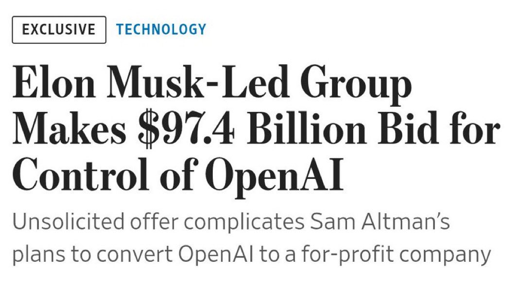 WSJ is reporting that @elonmusk is leading a group of investors who bid $97.4 BILLION for control of OpenAI. If this is true, Elon is making a big play to reduce AI risk for humanity by forcing untrustworthy Sam Altman aside. 👀 https://t.co/hW8HiPR2Em