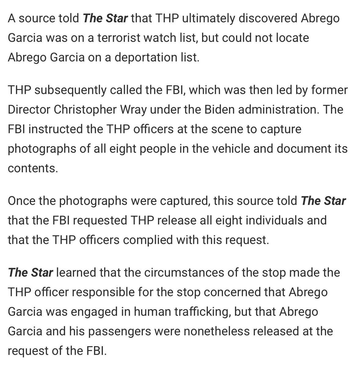 Wow @TheTNStar just broke a huge story. You know the illegal immigrant that Democrats are trying to free from an El Salvador prison? In 2022, he was stopped driving without a license and Tennessee Highway Patrol suspected him of trafficking the 7 people inside. THP then learned he was on a terrorist watch list so they called Biden’s FBI but Biden’s FBI told THP to RELEASE HIM. Kilmar Abrego Garcia was then released due to the Biden FBI order and the THP concerns about trafficking were ignored by the government. This is on top of a court + Maryland Police finding that they believe he was in MS-13 and his wife reporting that he beat her when filing for a protective order. This is who Democrats want in our country. This is who they’re fighting for. Evil! Link to full story: https://tennesseestar.com/justice/bidens-fbi-ordered-tn-highway-patrol-to-release-maryland-man-recently-deported-to-el-salvador-after-he-was-detained-in-2022-traffic-stop-on-suspicion-of-human-trafficking/tpappert/2025/04/16/ Incredible scoop by @realTomPappert and the @thetnstar team @michaelpleahy!