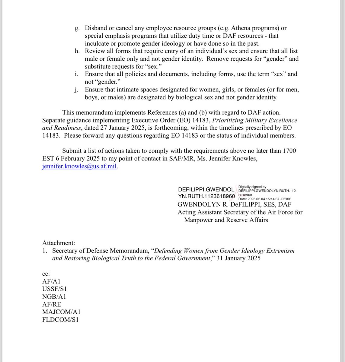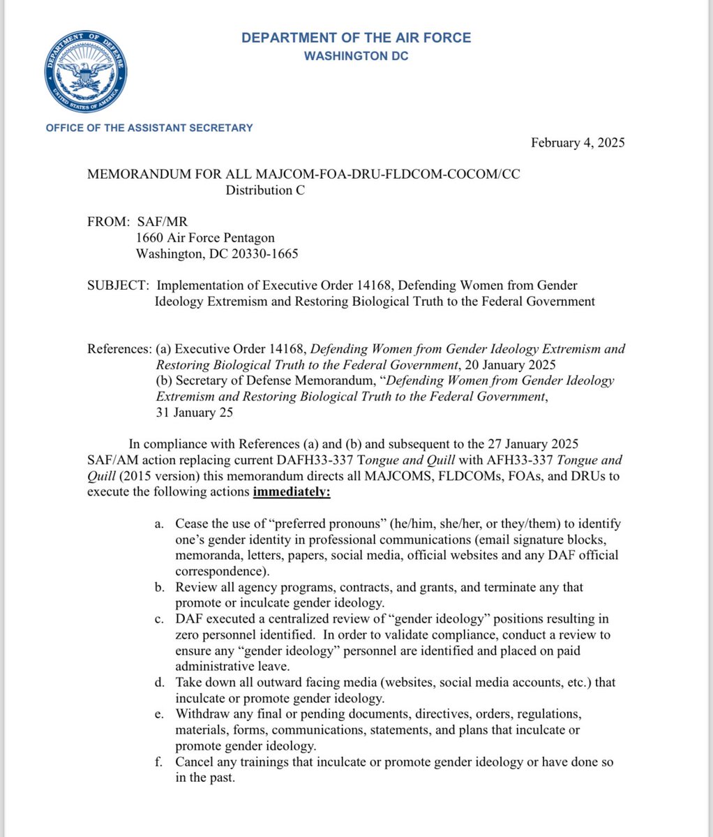 The Air Force sent out a memo directing all Air Force personnel to: • Stop using pronouns in all communications • Terminate all grants, contracts, trainings and programs that promote gender ideology • Ensure no men enter intimate female spaces • Remove any media, directives, plans or forms that promote gender ideology • Fire anyone in a "gender ideology position" • Disband employee resource groups who have ever promoted gender ideology • Remove other gender options from forms — it will be male or female ONLY going forward Sanity and normalcy are back. 🔥🔥🔥