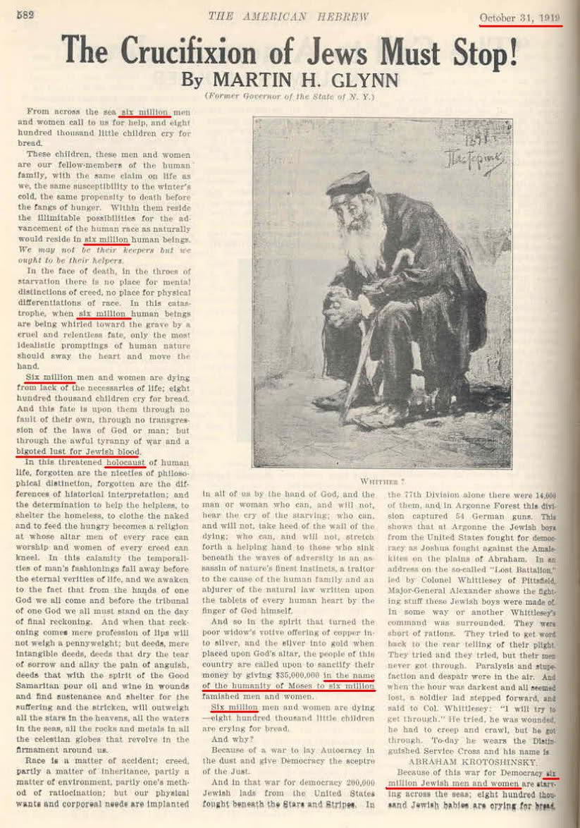 This article in the American Hebrew is interesting because it introduces the notion of "Holocaust" and "Six Million" in 1919, applying it to the end of WW1, therefore long before either Nazism or WW2. This narrative predates the Nazis. https://t.co/3FZGFI2Afa