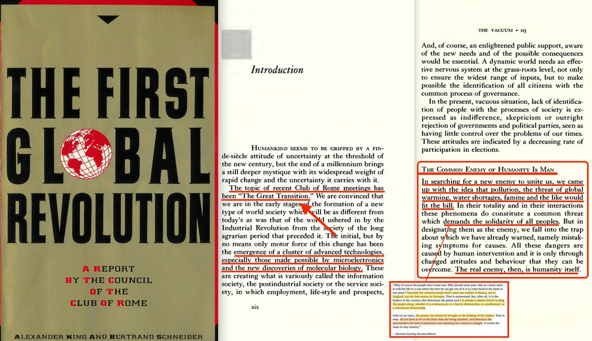 THE ORIGIN OF THE MYTH OF A CLIMATE CRISIS: The Club of Rome: "The First Global Revolution", 1991 " In searching for a common enemy against whom we can unite, **we came up with the idea that pollution, the threat of global warming**, water shortages, famine and the like, would fit the bill. In their totality and their interactions these phenomena do constitute a common threat which must be confronted by everyone together. But in designating these dangers as the enemy, we fall into the trap, which we have already warned readers about, namely mistaking symptoms for causes. All these dangers are caused by human intervention In natural processes. and it is only through changed attitudes and behaviour that they can be overcome. The real enemy then is humanity itself.. It would seem that men and women need a common motivation, namely a common adversary, to organize and act together in the vacuum. Such a motivation seemed to have ceased to exist or have yet to be found. The need for enemies seems to be a common historical factor. Bring the divided nation together to face an outside enemy, either a real one or else one invented for the purpose. Democracy will be made to seem responsible for the lagging economy, the scarcity and uncertainties. The very concept of democracy could then be brought into question and allow for the seizure of power."