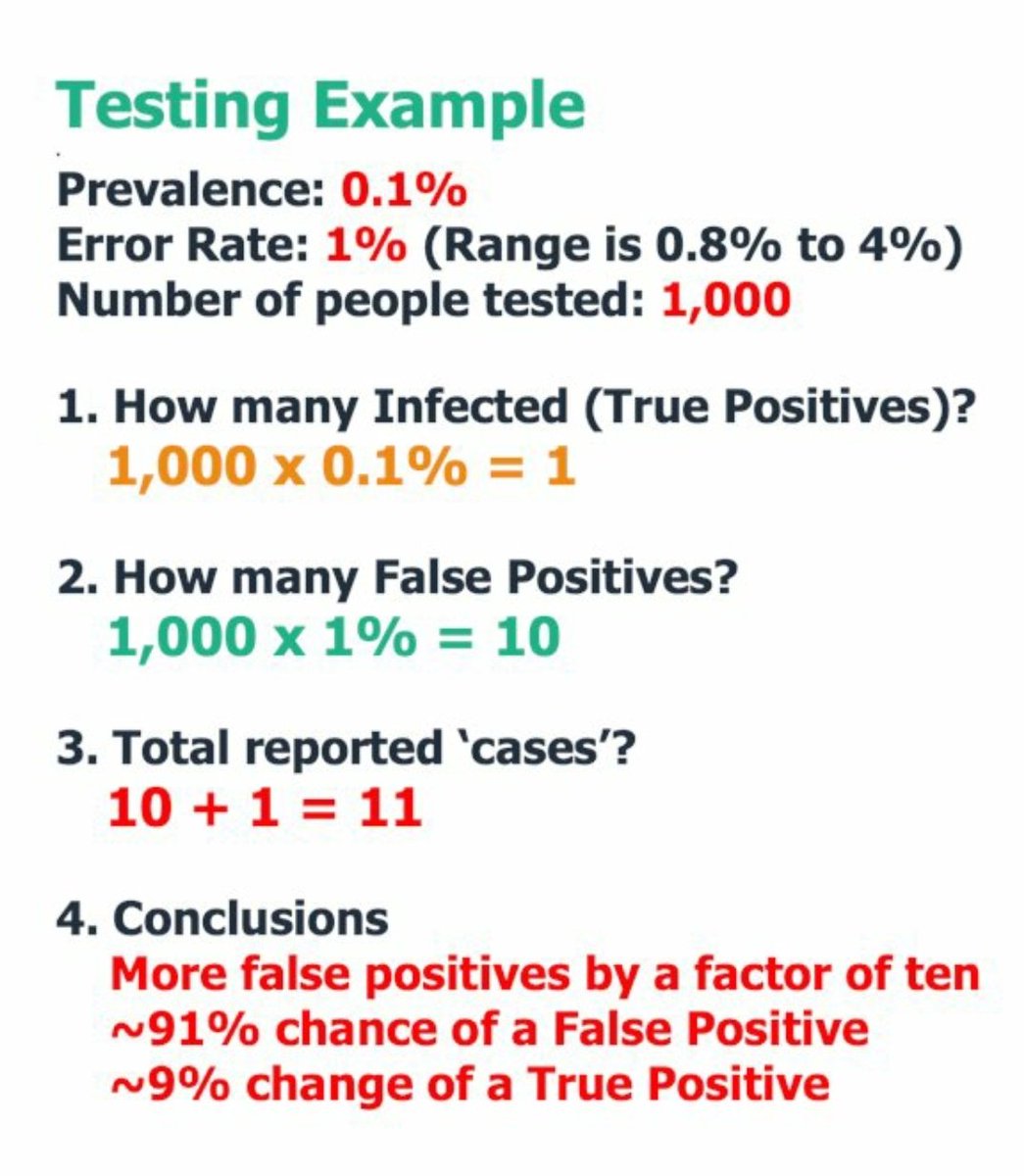 A simple example of #BayesTheorem with a prevalence of 0.1% (much higher than Covid19) an error range of 1% (RT-PCR Charité range est. 0.8-4%) and only 1,000 people tested: 91% false positives.