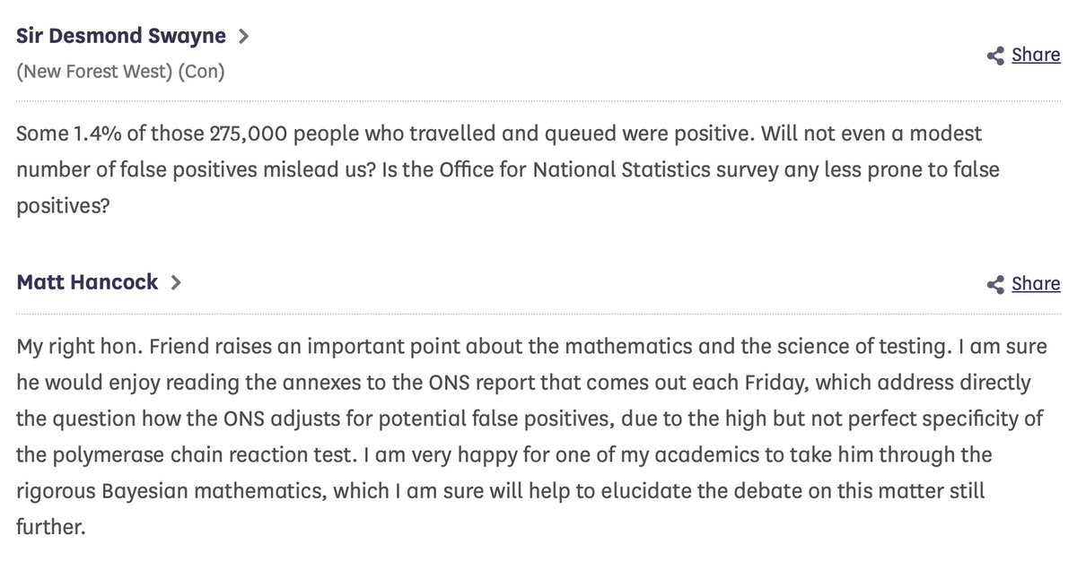 "I am very happy for one of my academics to take him through the rigorous Bayesian mathematics, which I am sure will help to elucidate the debate on this matter still further." @MattHancock to @DesmondSwayne https://hansard.parliament.uk/commons/2020-09-17/debates/92B2DEA8-5D74-42FA-923B-3A3C478494B7/Covid-19Update
