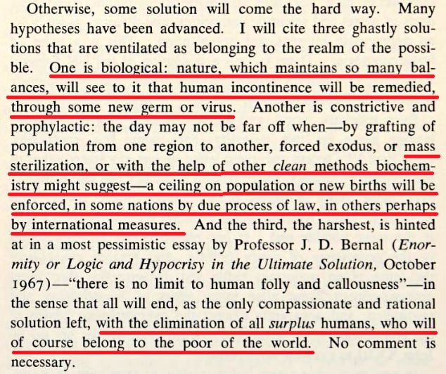 Club of Rome founder Aurelio Peccei in "The Chasm Ahead" London 1969 Peccei gives 3 "solutions" to the problem of "surplus humans" in 1969: 1. Biological "germ or virus" 2. "Mass sterilization" 3. "Elimination of all surplus humans" What stage are we at?