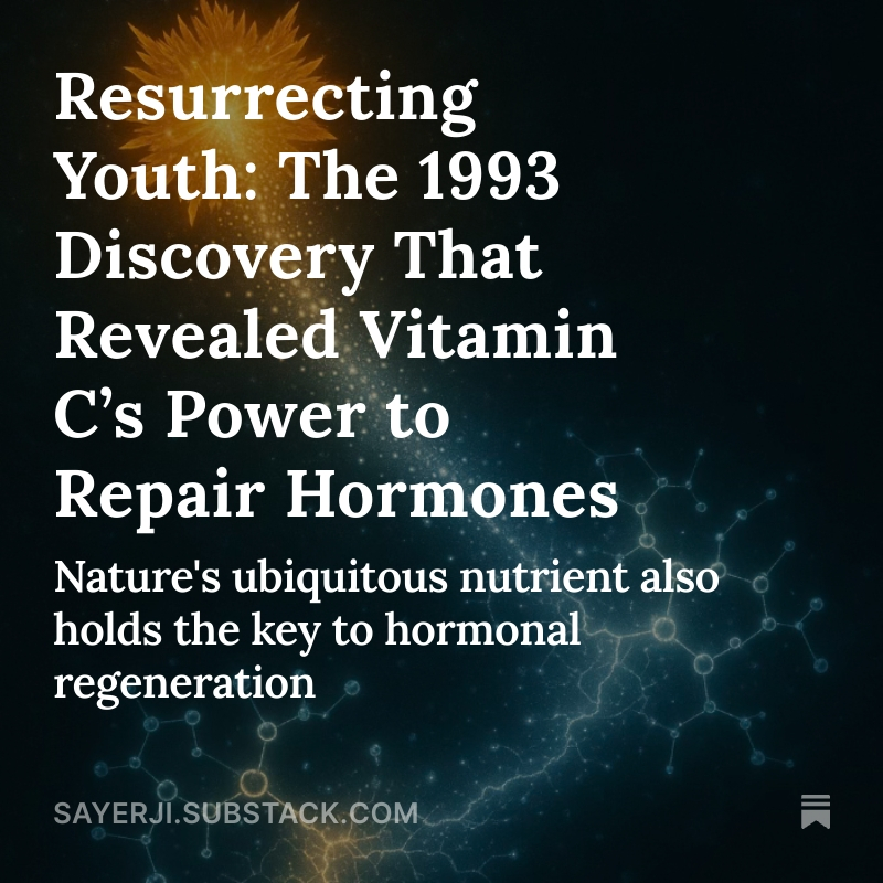 6/7 💡 THE PARADIGM SHIFT: We're not at the mercy of declining hormones as we age. Vitamin C shows us that nutritional medicine can actively REPAIR and RESTORE—not just prevent disease. Sometimes the most profound solutions are hiding in plain sight. Full article: https://sayerji.substack.com/p/resurrecting-youth-the-1993-discovery