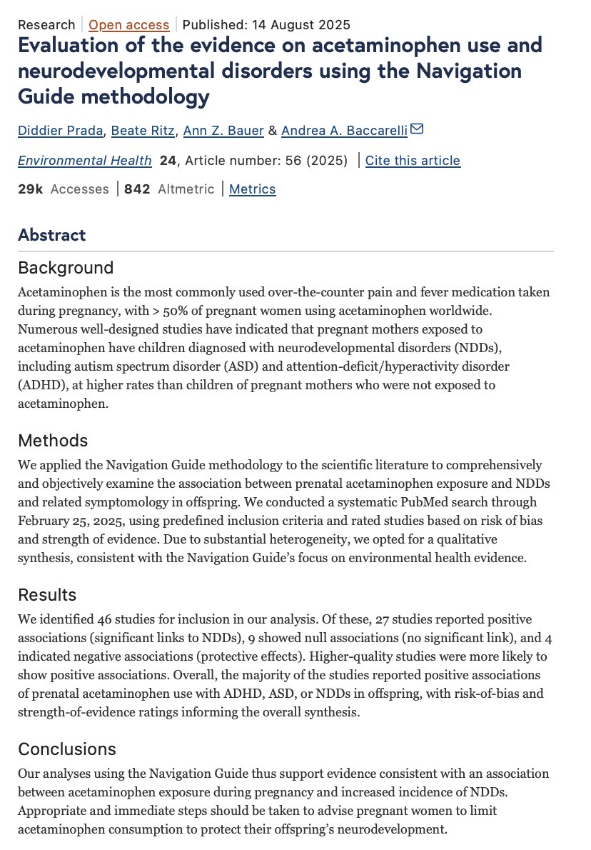 1⃣ The science is overwhelming: 46 studies analyzed by Harvard researchers show consistent association between prenatal acetaminophen exposure and neurodevelopmental disorders. ⚠️Every single study examining long-term effects on child brain development found evidence of harm - not one showed it was safe. Source study: 🔗https://ehjournal.biomedcentral.com/articles/10.1186/s12940-025-01208-0