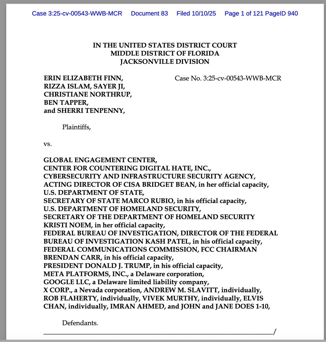 6/ Imran Ahmed is a defendant in our federal civil rights lawsuit—alongside EVERY entity that colluded to censor Americans. We're holding accountable government agencies, tech platforms, and the entire apparatus. Support the fight to restore constitutional governance: https://sayerji.substack.com/p/on-trial-for-truth-replay-of-live Track our ongoing lawsuit here: https://www.courtlistener.com/docket/70274698/parties/finn-v-global-engagement-center/ The Republic needs you. 🔥 PLEASE SHARE THIS.
