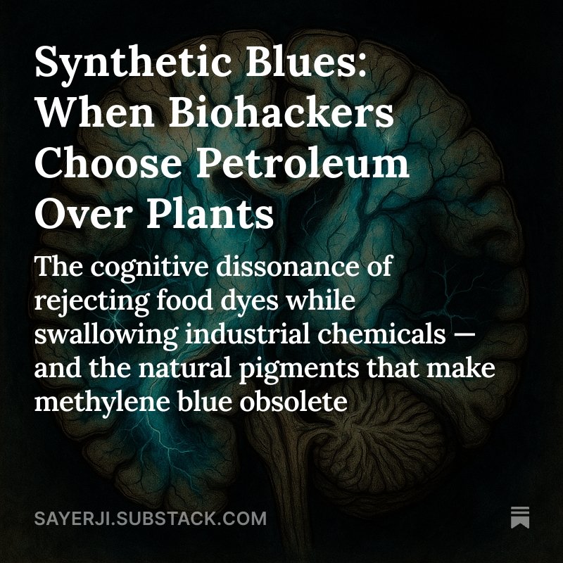 🔟Bottom line: MB is an emergency antidote being misused as a daily supplement. No long-term safety studies exist for healthy people taking it regularly. If we reject coal tar dyes in food, why accept them in our brains? Choose coherence. Choose nature. See red over methylene blue. 👉Read my substack deep dive on the topic here: Synthetic Blues: When Biohackers Choose Petroleum Over Plants https://sayerji.substack.com/p/synthetic-blues-when-biohackers-choose